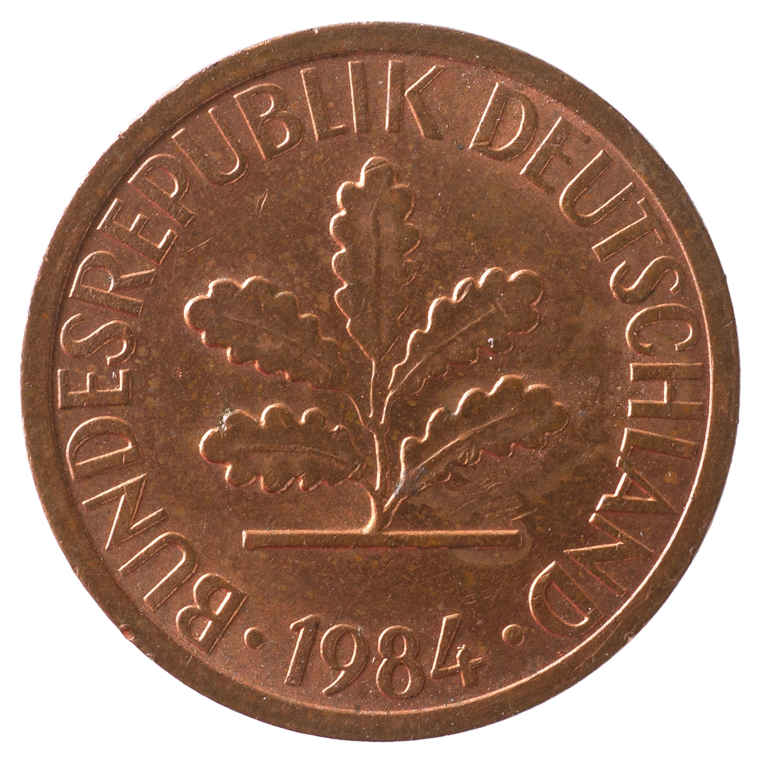 U sredini mladica hrasta s pet listova u vodoravnoj liniji. Uz rub ispisan tekst BUNDESREPUBLIK DEUTSCHLAND i godina 1984.