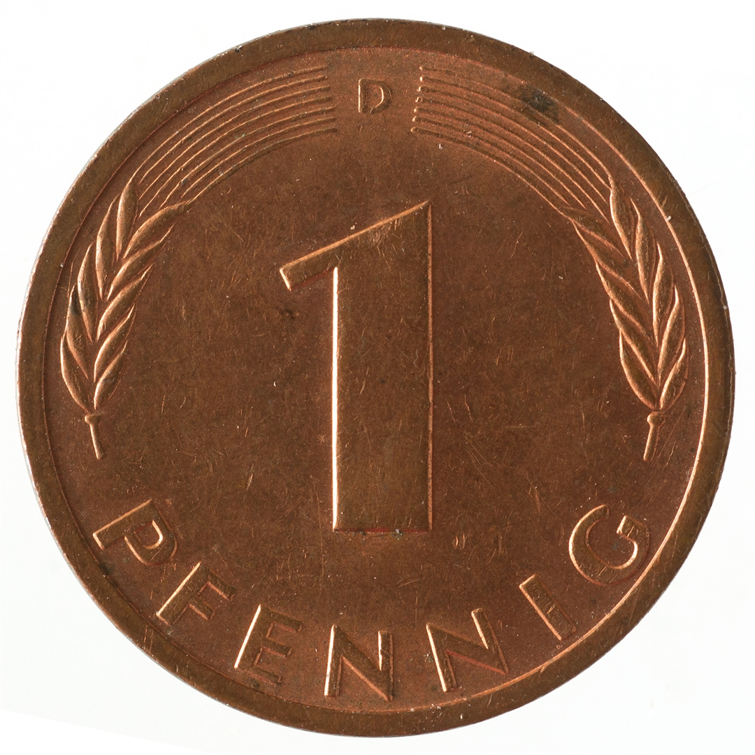 U sredini broj 1. Na vrhu slovo D (oznaka kovnice), a uz donji rub riječ PFENNIG.