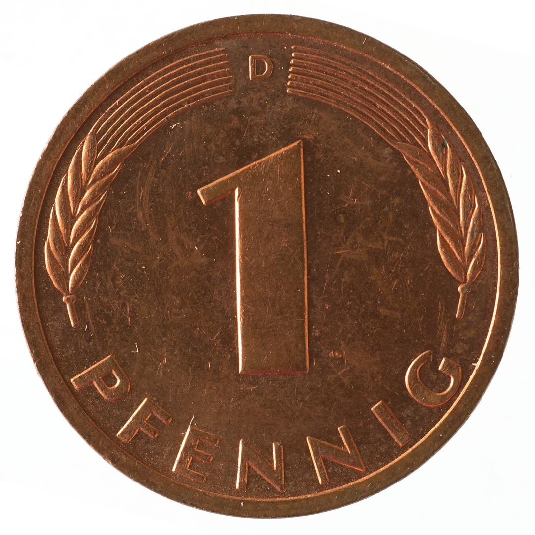 Avers: U sredini mladica hrasta s pet listova u vodoravnoj liniji. Uz rub ispisan tekst BUNDESREPUBLIK DEUTSCHLAND i godina 1984. Revers: U sredini broj 1. Na vrhu slovo D (oznaka kovnice), a uz donji rub riječ PFENNIG.