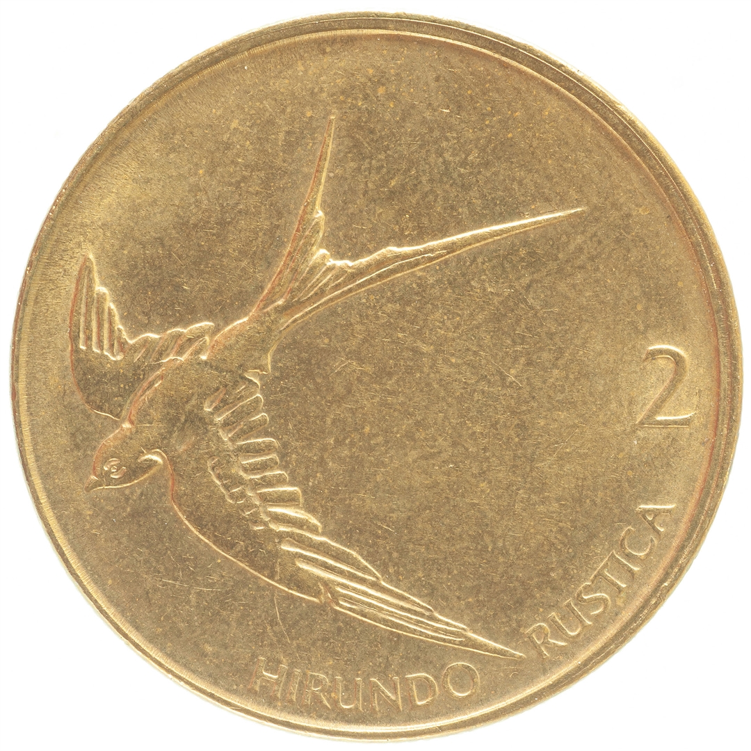 Avers: U sredini kovanice nalazi se broj 2, a uz rub tekst REPUBLIKA SLOVENIJA DVA TOLARJA. Uz desni nalazi se godina kovanja. Revers: Središnji dio kovanice zauzima prikaz lastavice u letu. Uz desni rub nalazi se broj 2 a ispod njega uz rub tekst HIRUNDO RUSTICA.
