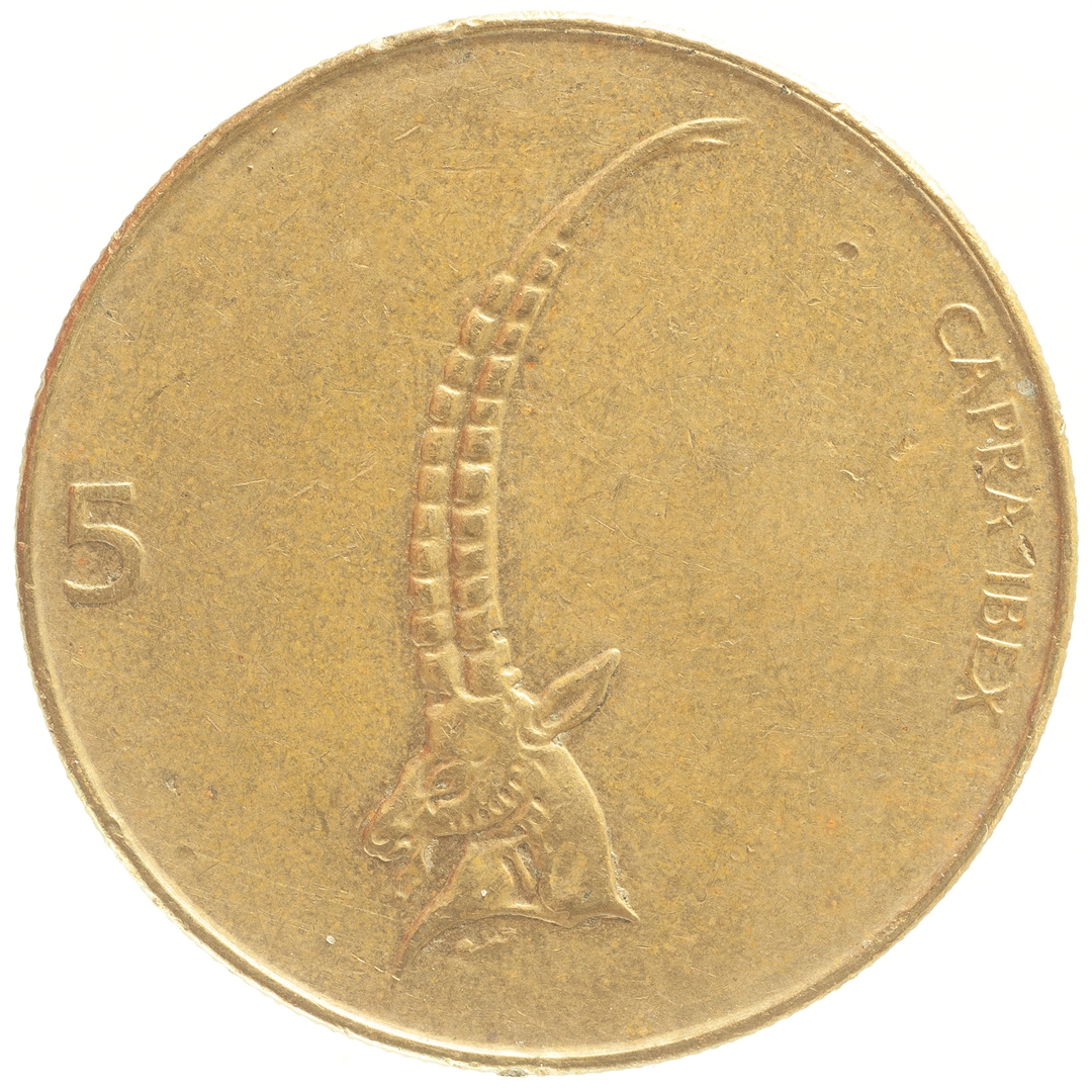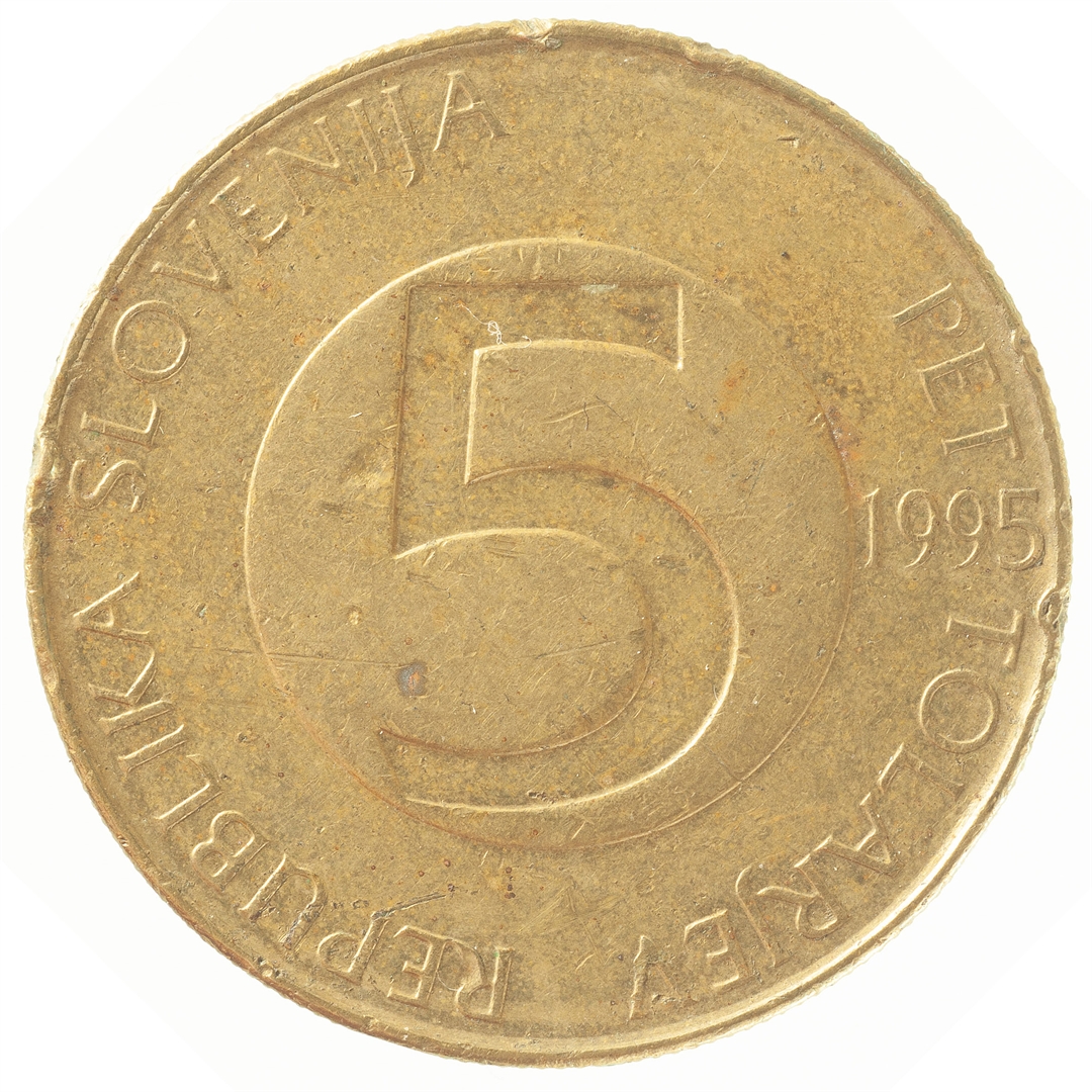 Avers: U sredini kovanice nalazi se broj 5 a uz rub tekst REPUBLIKA SLOVENIJA PET TOLARJEV. Uz desni nalazi se godina kovanja. Revers: U sredini glava alpskog kozoroga. Uz lijevi rub broj 5, a uz desni tekst CAPRA IBEX.