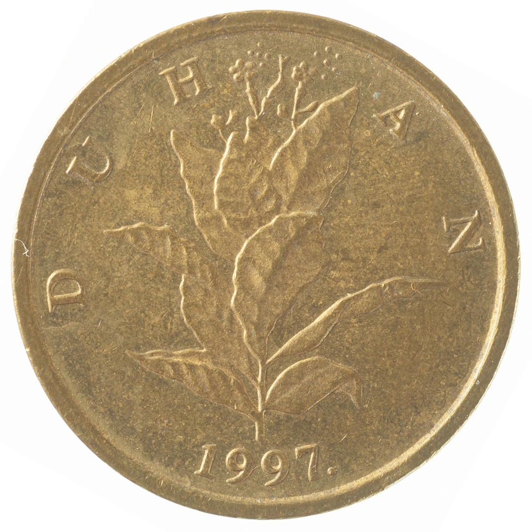 U središnjem dijelu stilizirana stabljika duhana u cvatu. Iznad prikaza, kružno uz rub, natpis "DUHAN". Uz donji rub, u središnjem dijelu, godina kovanja.