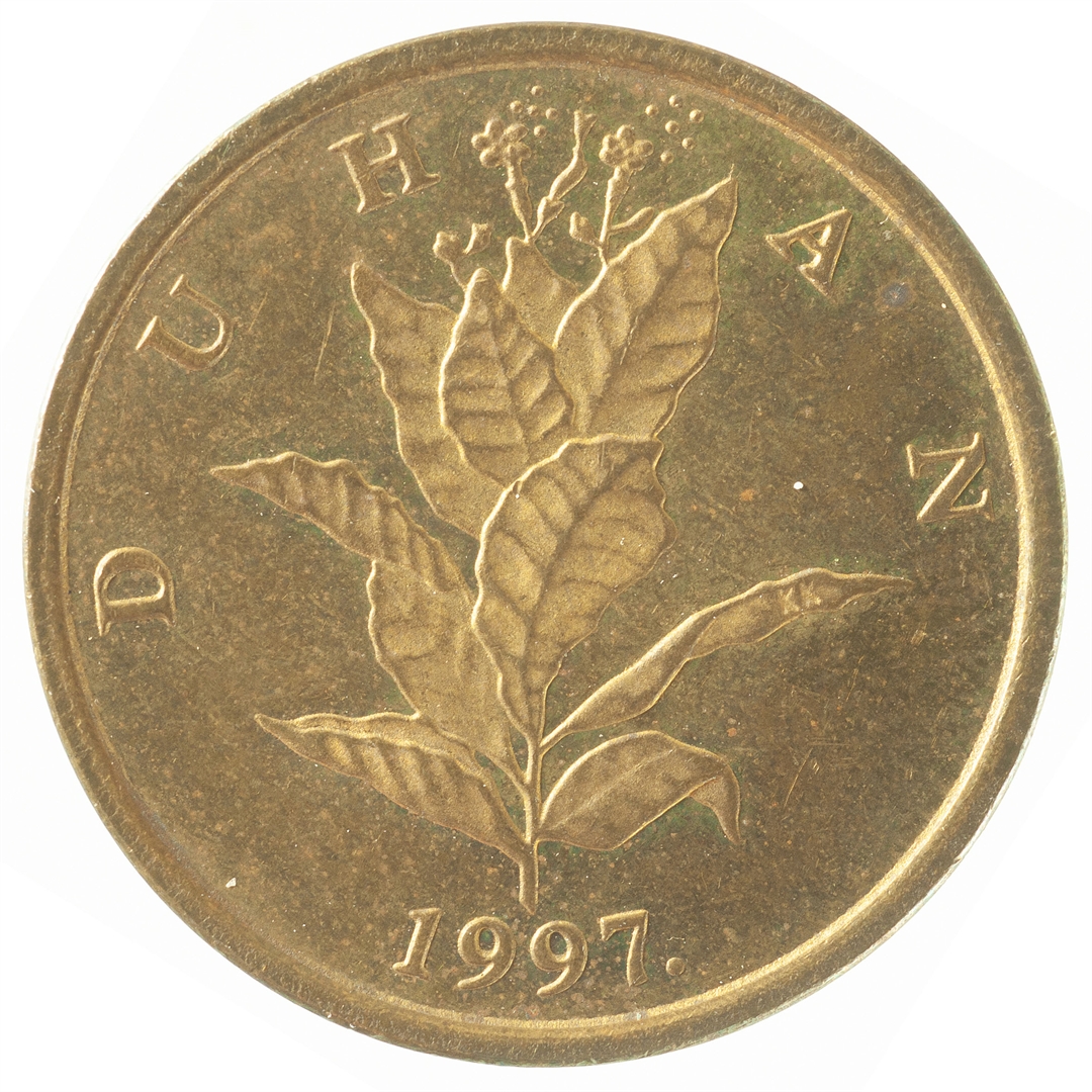 U središnjem dijelu stilizirana stabljika duhana u cvatu. Iznad prikaza, kružno uz rub, natpis "DUHAN". Uz donji rub, u središnjem dijelu, godina kovanja.