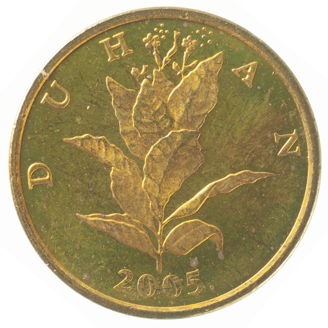 U središnjem dijelu stilizirana stabljika duhana u cvatu. Iznad prikaza, kružno uz rub, natpis "DUHAN". Uz donji rub, u središnjem dijelu, godina kovanja.