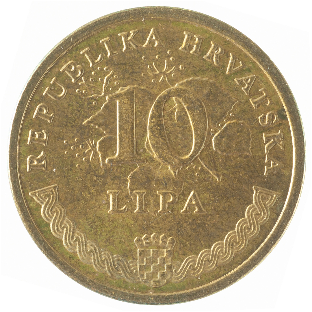 U središnjem dijelu nominala "10 LIPA", a u pozadini prikaz stilizirane grane lipe u cvatu. U gornjem polukrugu, uz rub, natpis "REPUBLIKA HRVATSKA". Uz donji rub, u središnjem dijelu, prikaz grba Republike Hrvatske od kojeg je lijevo i desno prikaz pleterne ornamentike.