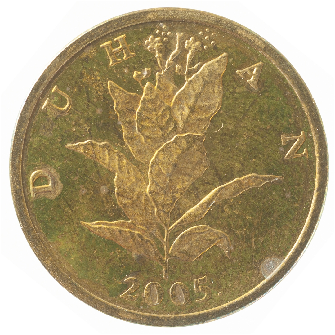U središnjem dijelu stilizirana stabljika duhana u cvatu. Iznad prikaza, kružno uz rub, natpis "DUHAN". Uz donji rub, u središnjem dijelu, godina kovanja.