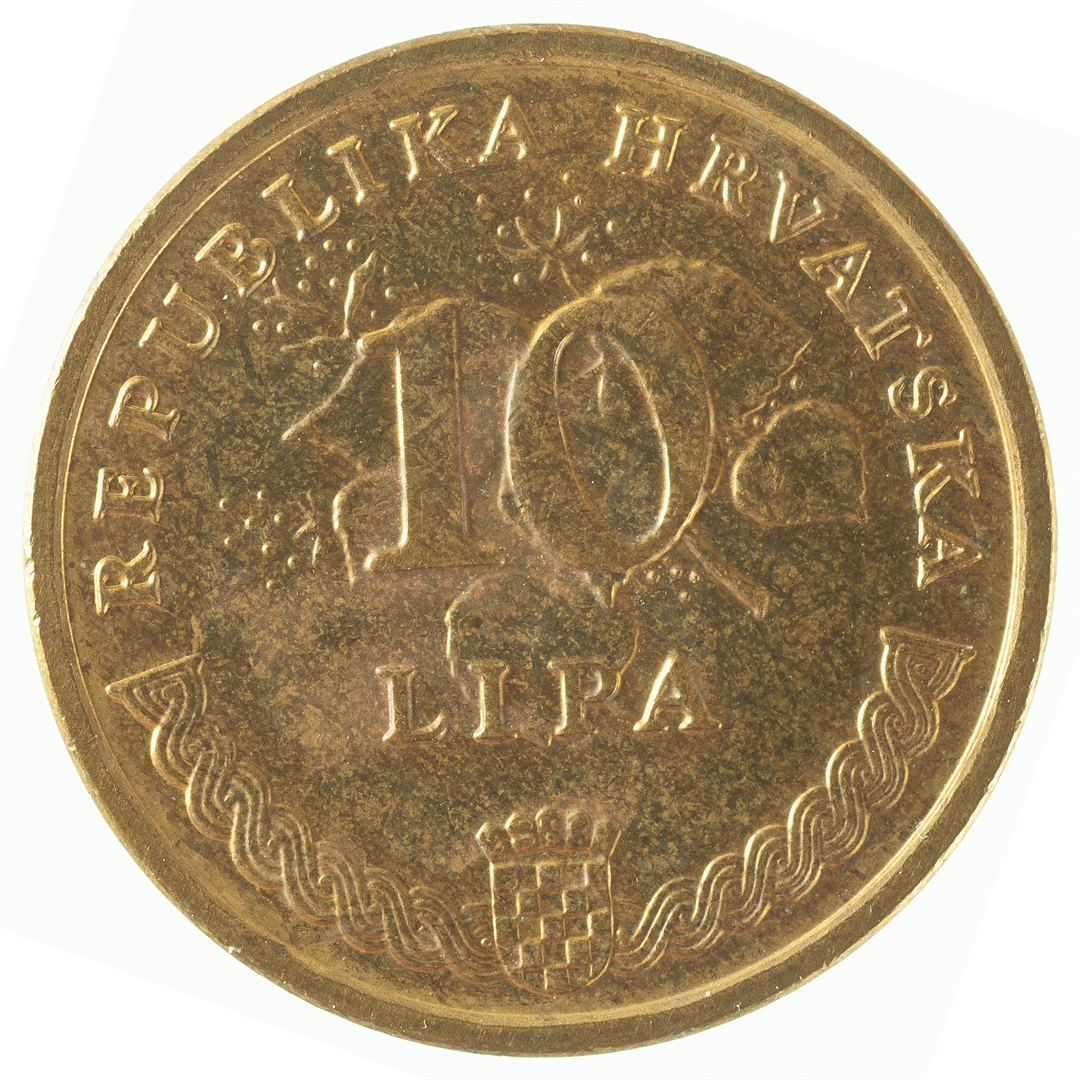 U središnjem dijelu nominala "10 LIPA", a u pozadini prikaz stilizirane grane lipe u cvatu. U gornjem polukrugu, uz rub, natpis "REPUBLIKA HRVATSKA". Uz donji rub, u središnjem dijelu, prikaz grba Republike Hrvatske od kojeg je lijevo i desno prikaz pleterne ornamentike.