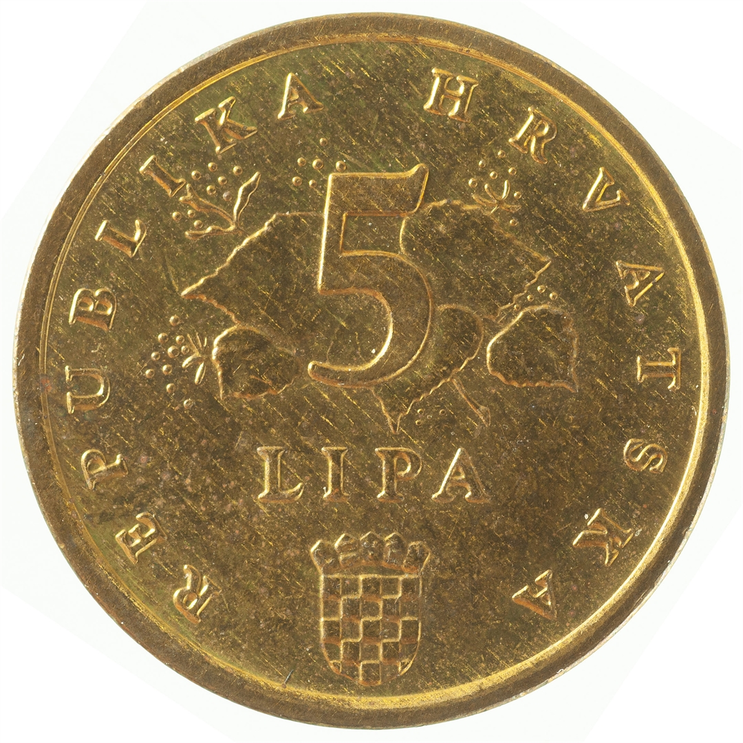 U središnjem dijelu nominala "5 LIPA", a u pozadini prikaz stilizirane grane lipe u cvatu. Kružno, uz rub, natpis "REPUBLIKA HRVATSKA". Uz donji rub prikaz grba Republike Hrvatske.