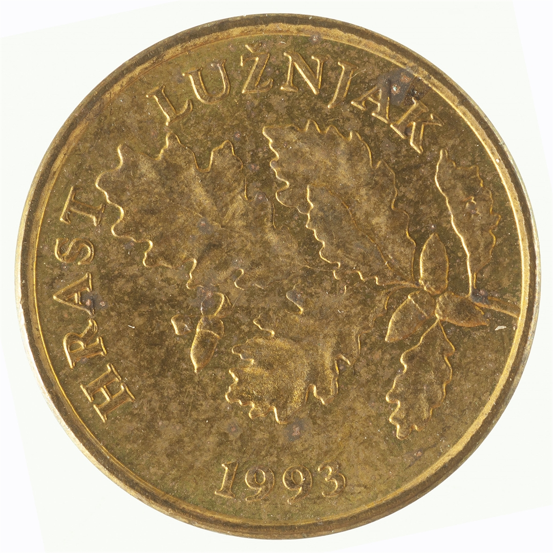 U središnjem dijelu prikaz stilizirane grane hrasta lužnjaka s plodovima. Iznad prikaza, kružno uz rub, natpis "HRAST LUŽNJAK" . Uz donji rub, u središnjem dijelu, godina kovanja.