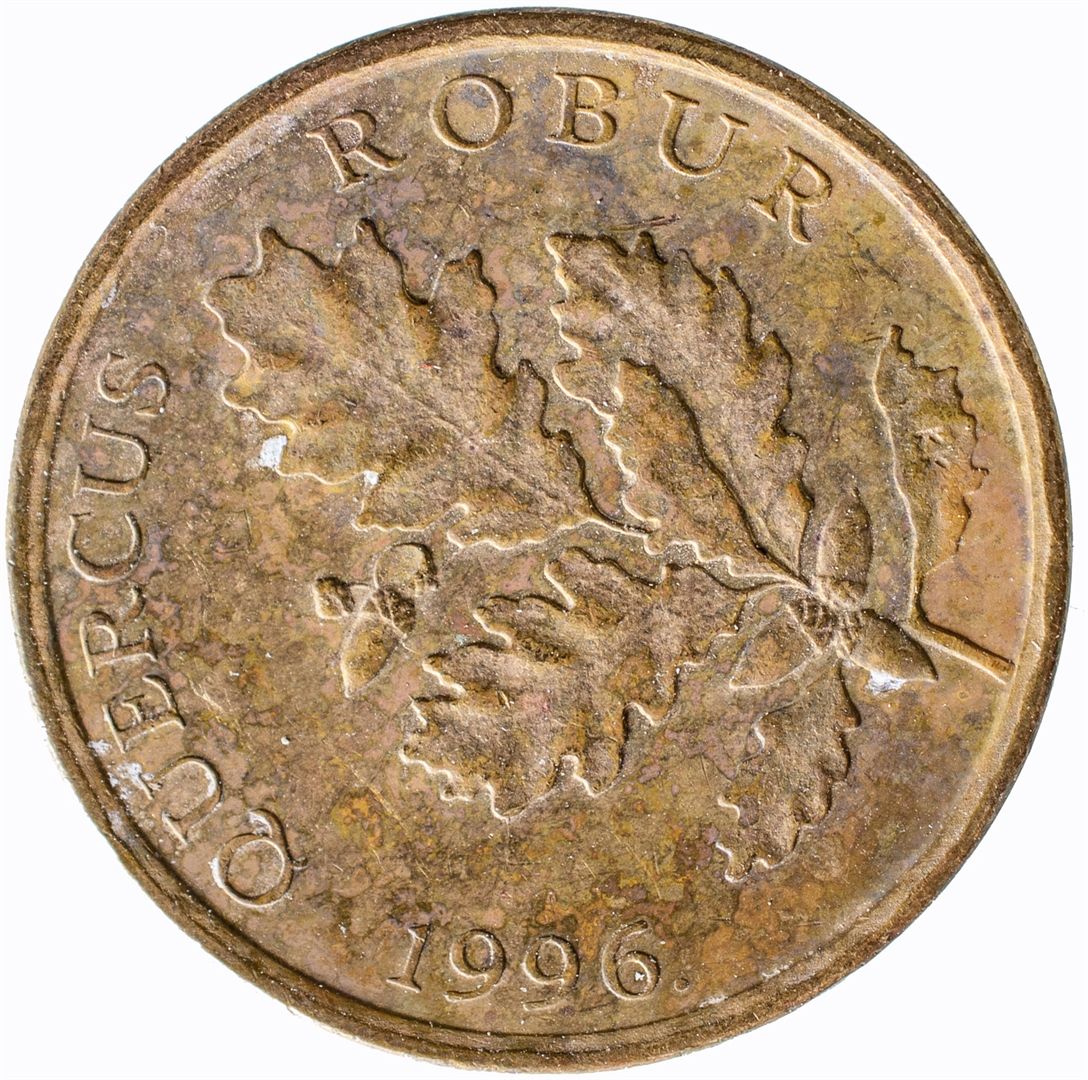 U središnjem dijelu prikaz stilizirane grane hrasta lužnjaka s plodovima. Iznad prikaza, kružno uz rub, natpis "HRAST LUŽNJAK" . Uz donji rub, u središnjem dijelu, godina kovanja.