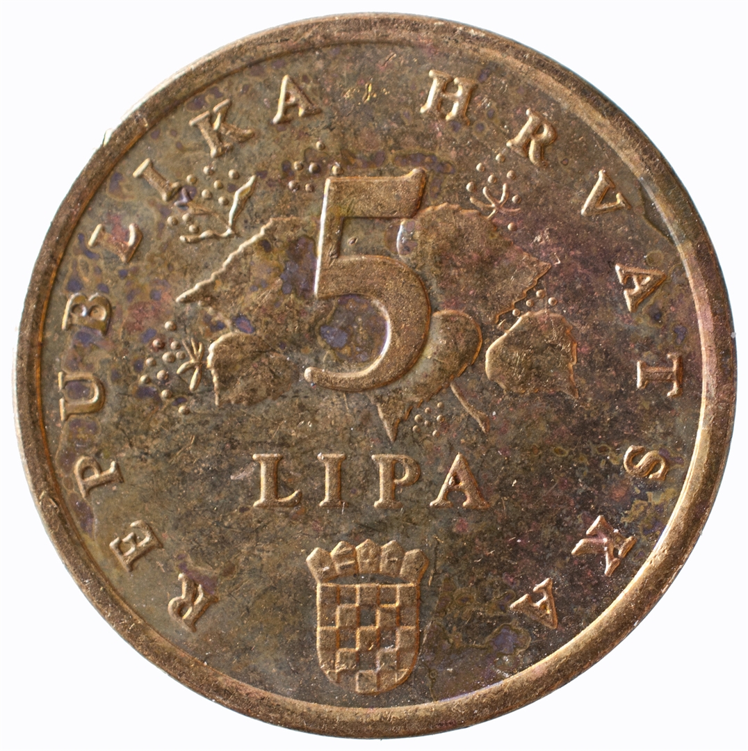 U središnjem dijelu nominala "5 LIPA", a u pozadini prikaz stilizirane grane lipe u cvatu. Kružno, uz rub, natpis "REPUBLIKA HRVATSKA". Uz donji rub prikaz grba Republike Hrvatske.