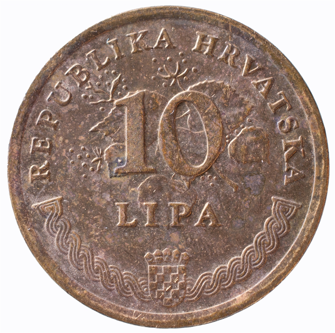 U središnjem dijelu nominala "10 LIPA", a u pozadini prikaz stilizirane grane lipe u cvatu. U gornjem polukrugu, uz rub, natpis "REPUBLIKA HRVATSKA". Uz donji rub, u središnjem dijelu, prikaz grba Republike Hrvatske od kojeg je lijevo i desno prikaz pleterne ornamentike.