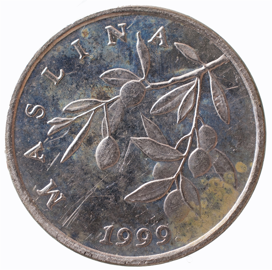U središnjem dijelu stilizirana grana masline s plodovima. Polukružno, uz lijevi rub, natpis "MASLINA". Uz donji rub, u središnjem dijelu, godina kovanja.