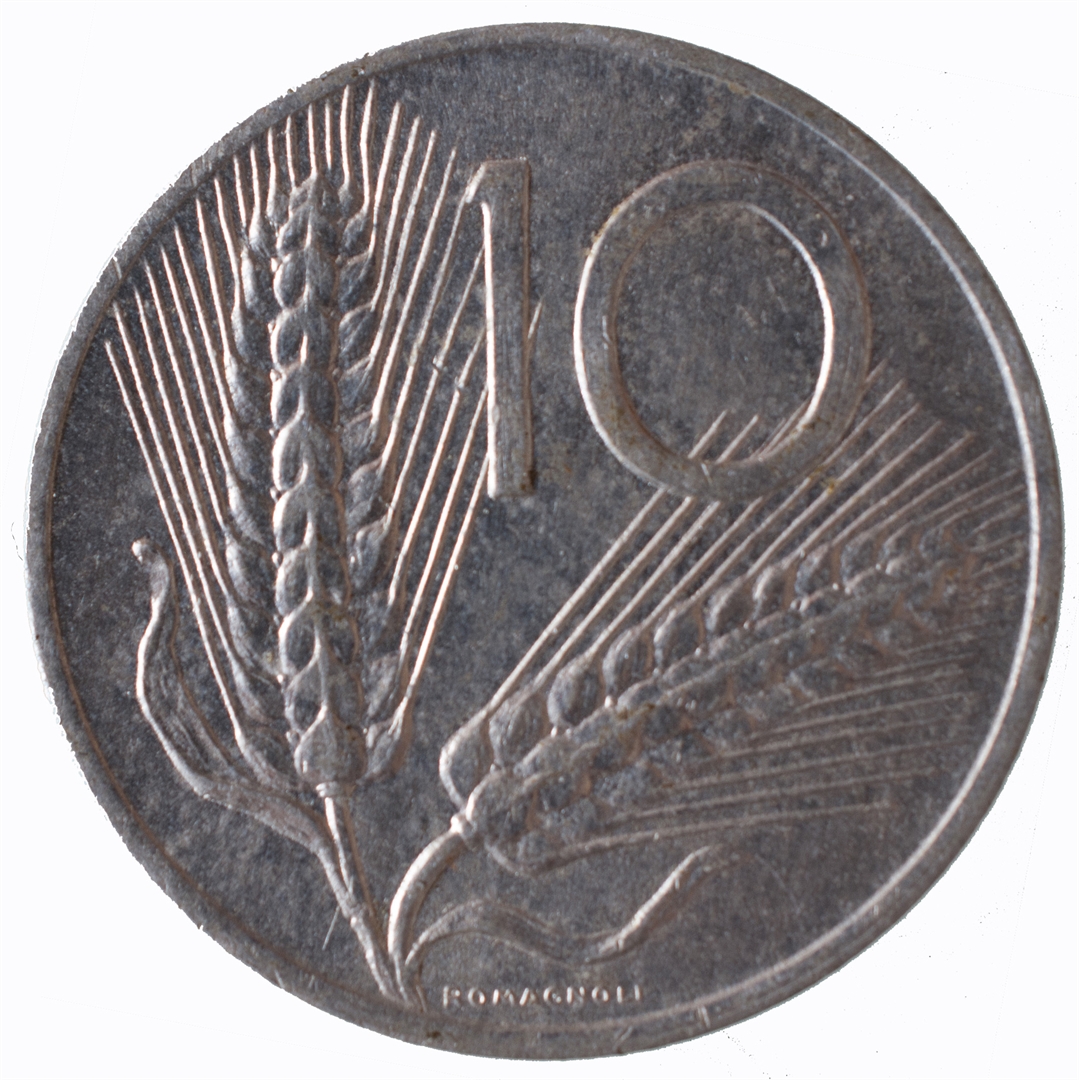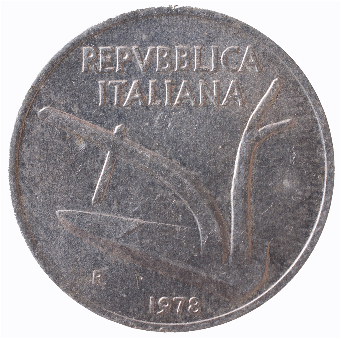Centralni dio zauzima prikaz pluga iznad kojeg se nalazi tekst u dva reda REPUBLICA ITALIANA. Ispod pluga nalazi se slovo R i godina kovanja.