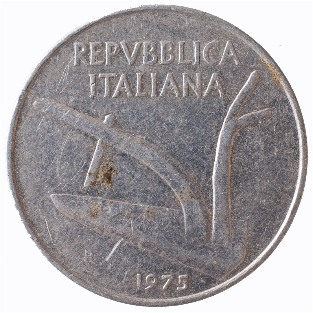Centralni dio zauzima prikaz pluga iznad kojeg se nalazi tekst u dva reda REPUBLICA ITALIANA. Ispod pluga nalazi se slovo R i godina kovanja.