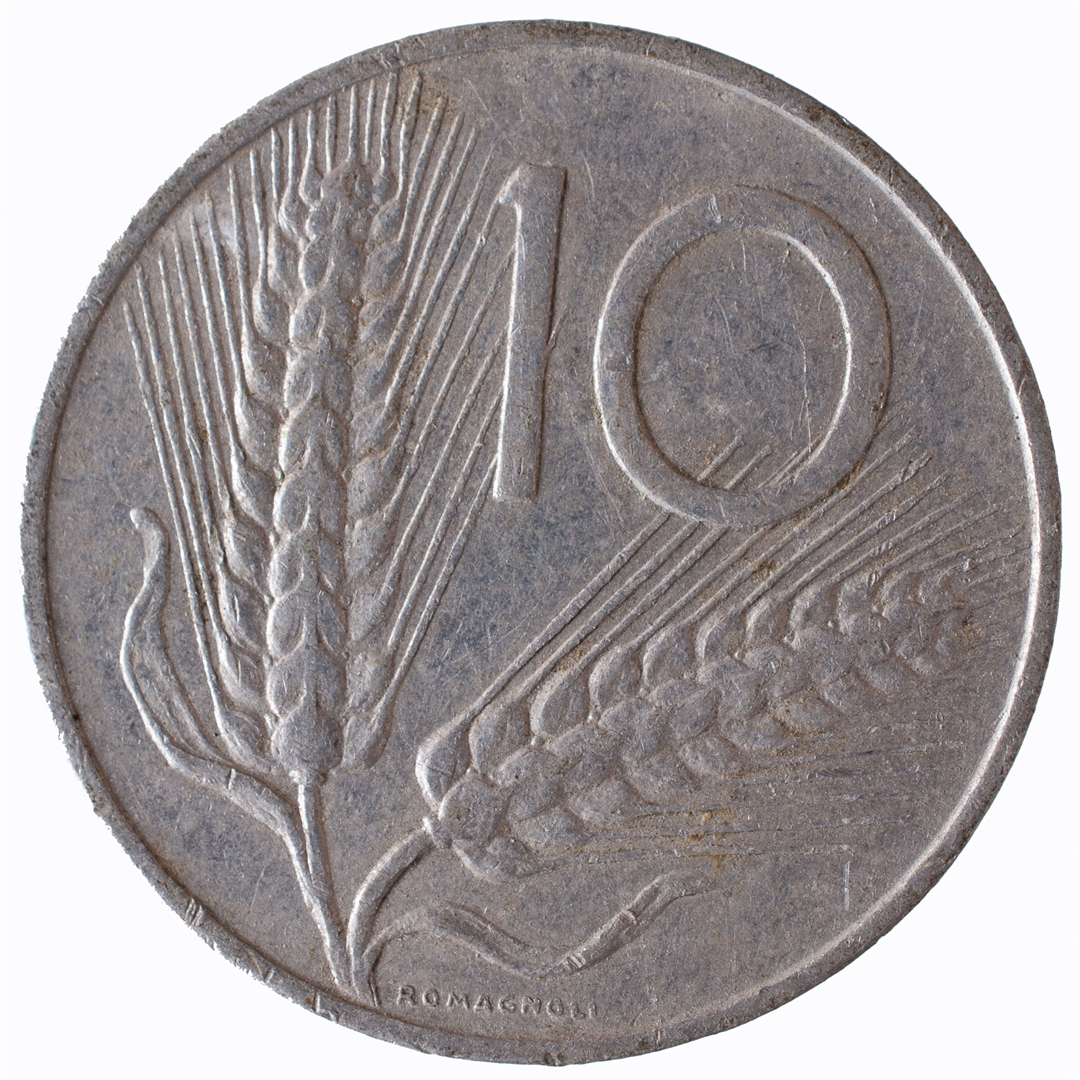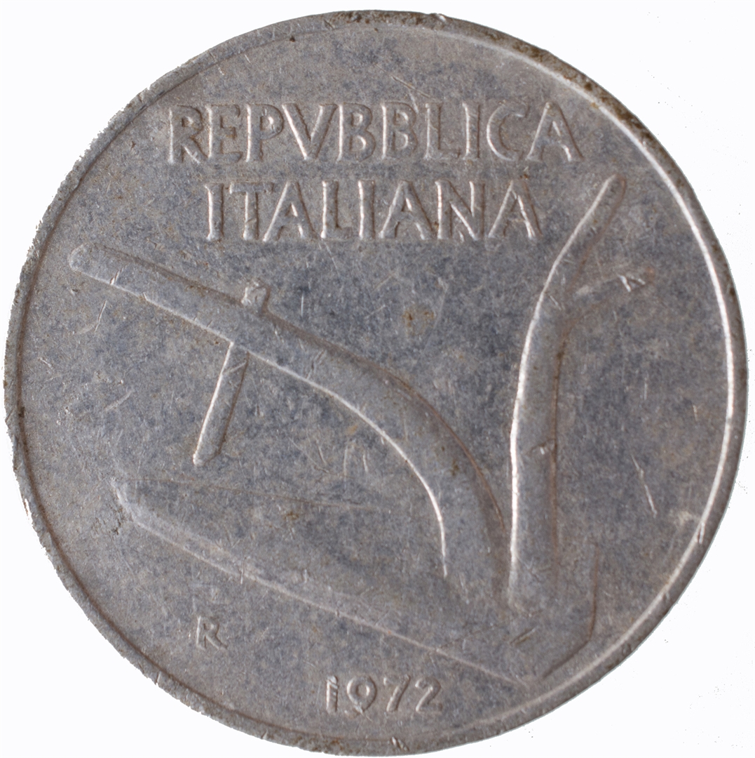 Centralni dio zauzima prikaz pluga iznad kojeg se nalazi tekst u dva reda REPUBLICA ITALIANA. Ispod pluga nalazi se slovo R i godina kovanja.