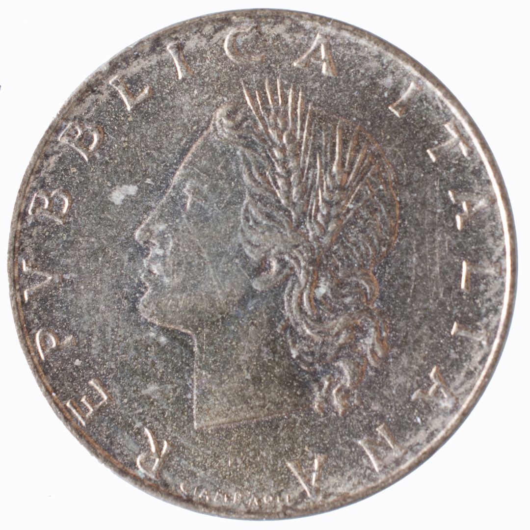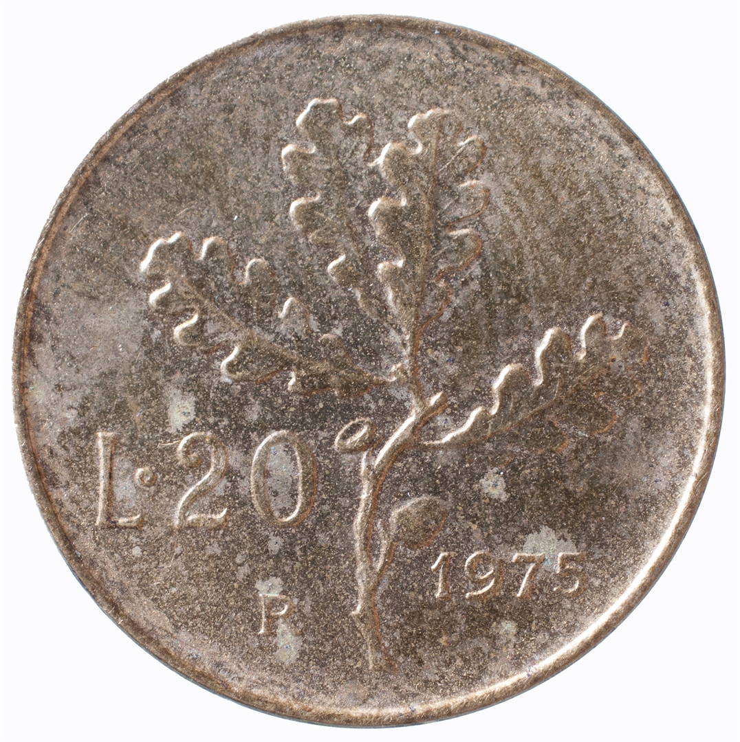 Avers: Profil žene sa pogledom u lijevo u čijoj se kosi nalaze dvaklasa pšenice. Uz rub kovanice tekst REPUBLICA ITALIANA. Revers: Centralni dio zauzima prikaz grane hrasta. U donjem djelu sa lijeve strane nalazi se tekst L 20, a ispod njega slovo P. Sa desne strane nalazi se godina kovanja.