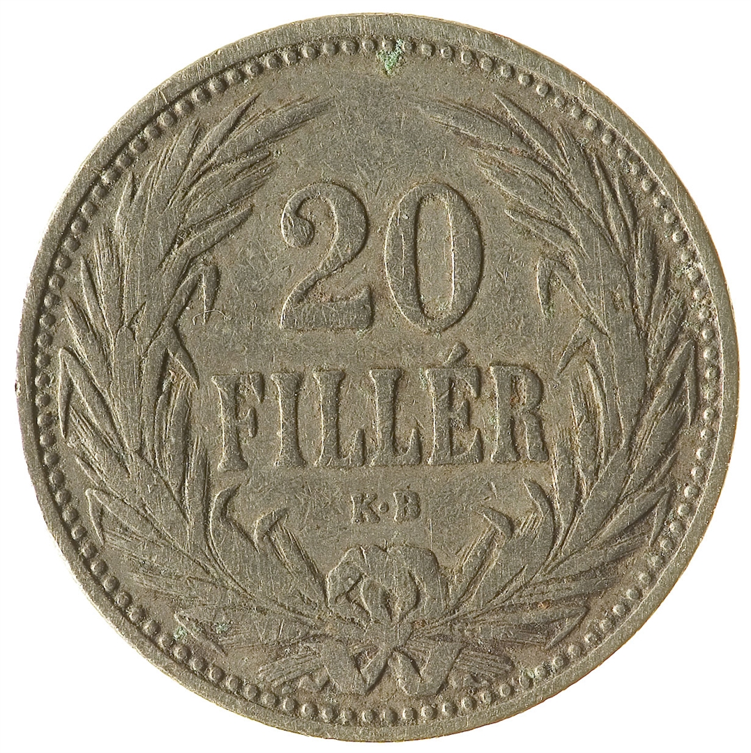 Avers: sveta mađarska kruna uokvirena natpisom: MAGYAR KIRALYI VALTOPENZ i zvijezdom; ispod krune je godina 1893. Revers: 20 / FILLER / K·B uokvireno vijencem