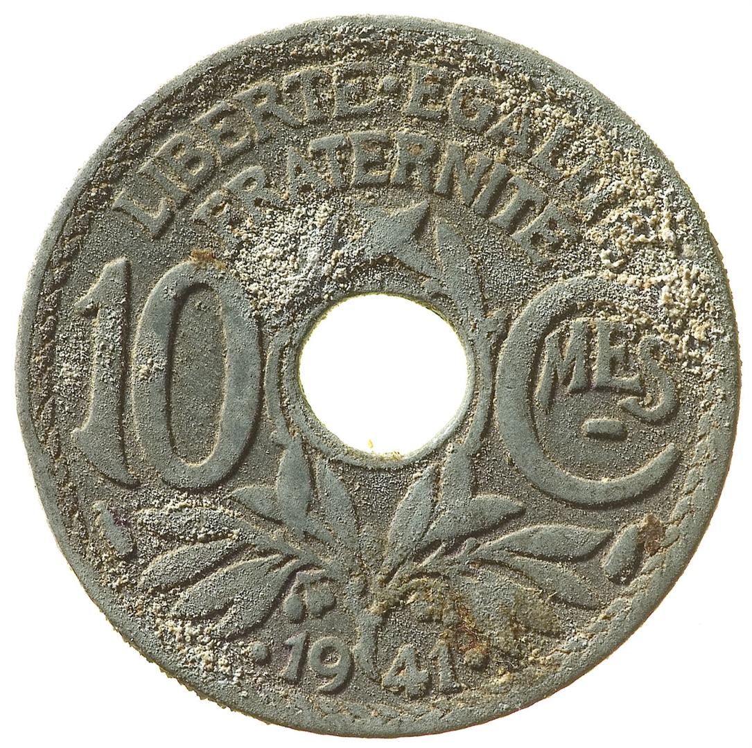 Avers: monogram RF unutar vijenca koji je odijeljen rupom u sredini kovanice, nad kojom je kapa Slobode Revers: denominacija 10 CMES podijeljena rupom u sredini kovanice; ispod je motiv grana, na dnu je godina 1941, a na vrhu natpis: LIBERTÉ•ÉGALITÉ•FRATERNITÉ