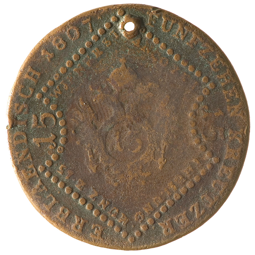 Avers: poprsje cara Franje II (I) u profilu udesno unutar okvira oblika udubljenog dijamanta; vrijednost (15) je upisana u uvlakama okvira. Uz run teče natpis: ZHUN·BOEH·GALIZ·U·LOB·FRANZKAIS·V·OEST·KOEN Revers: okrunjeni dvoglavi carski orao unutar okvira oblika udubljenog dijamanta; vrijednost (15) je upisana u uvlakama okvira i na grudima orla. Uz rub teče natpis: ERBLAENDISCH·1807·FUNFZEHEN KREUTZER Kovanica je probušena uz gornji rub.