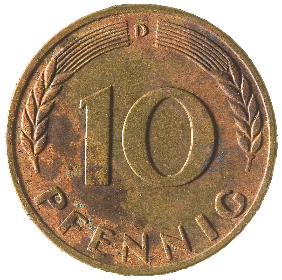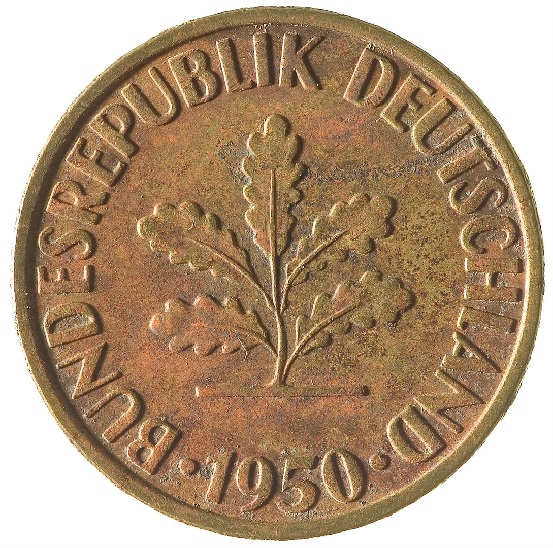 Avers: u sredini je pet hrastovih listova ispod kojih je godina 1950; uz rub teče natpis: BANK DEUTSCHLAND Revers:10 / PFENNING, uokviren s po jedni žitnim klasjem sa svake strane; na vrhu je oznaka kovnice: D