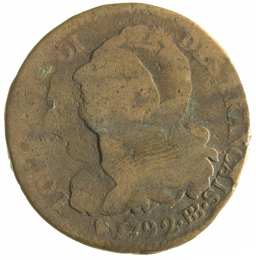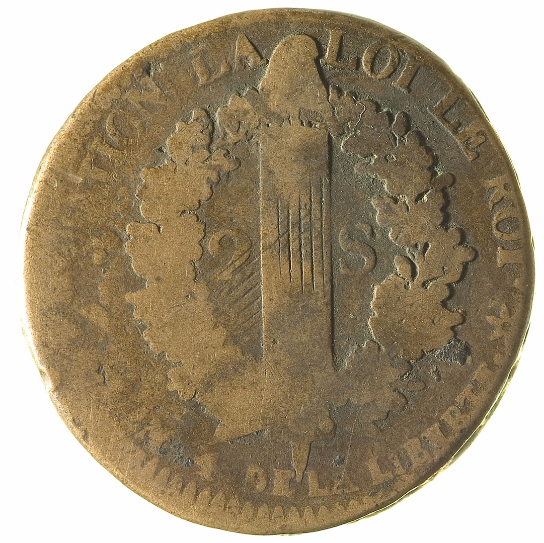 Avers: poprsje kralja Luja XVI okrenuto ulijevo; uz rub teče oštećen natpis: LOUIS XVI ROI DES FRANCAIS•1792•HB Revers: liktorski snop pruća s frigijskom kapom na vrhu uokviren dvjema hrastovim granama; s obje strane liktorskog snopa je oznaka vrijednosti: 2 S; uz rub teče dijelom čitljiv natpis: LA NATION LA LOI LE ROI * L''AN 4 DE LA LIBERTE