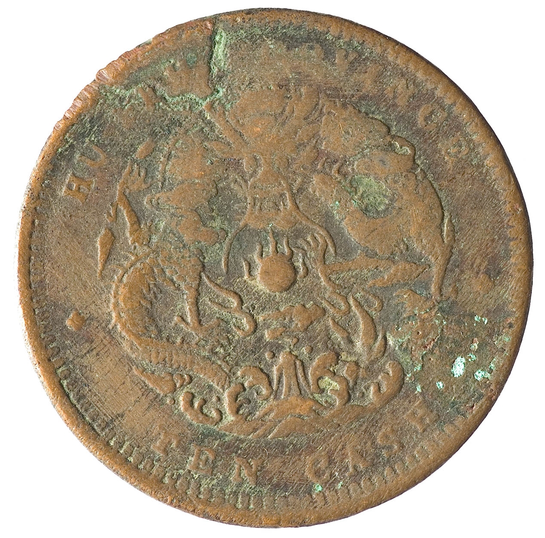 Avers: četir kineska ideograma (koji se čitaju odozgo prema dolje, zdesa nalijevo) s cvijetom u sredini, sa mandžurijskim znakovima sa strane i kineskim ideogramima iznad i ispod; legenda: 造省北湖 ᠪᠣᠣ ᠶᡠᠸᠠᠨ 光 寶元 緒 十當 Revers: zmaj s biserom u sredini i planinom ispod okruženi su legendom na engleskom jeziku koja teče uz rub: HU–PEH PROVINCE * TEN CASH *
