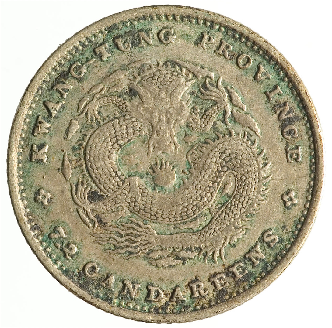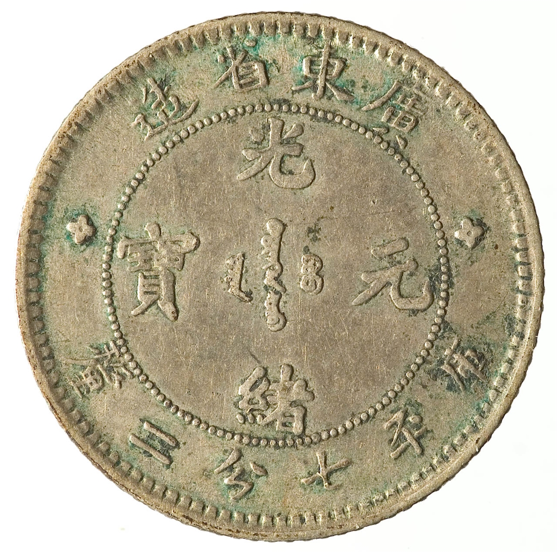 Avers: četir kineska ideograma (koji se čitaju odozgo prema dolje, zdesa nalijevo) s cvijetom u sredini, sa mandžurijskim znakovima sa strane i kineskim ideogramima iznad i ispod; legenda: 造省北湖 光 ᠪᠠᡩᠠᡵᠠᠩᡤᠠ 寶 ᠶᡠᠸᠠᠨ ᠪᠣᠣ 元 ᡩᠣᡵᠣ 緒 釐二分七平庫 Revers: zmaj s biserom u sredini okružen legendom na engleskom jeziku koja teče uz rub: HU-PEH PROVINCE 7.2 CANDAREENS