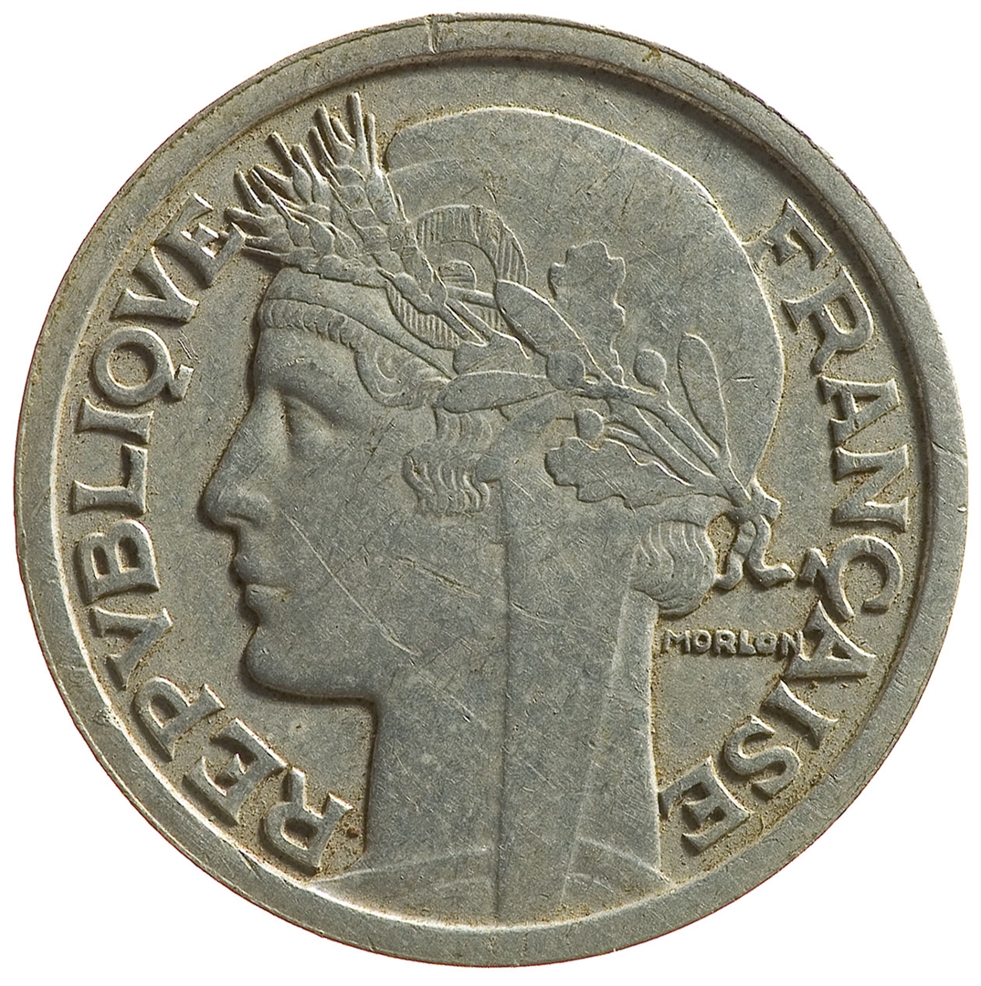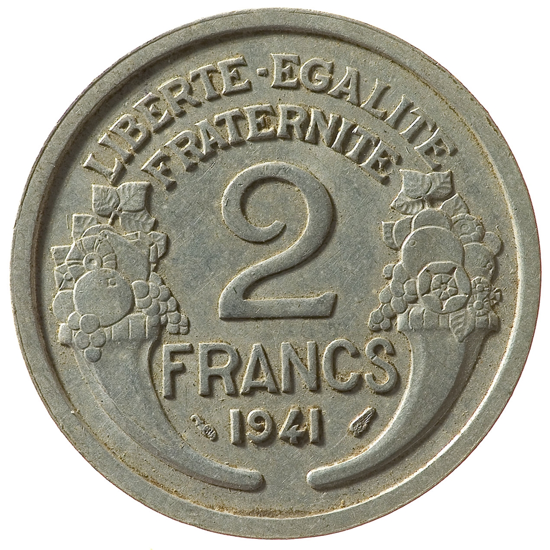 Avers: ovjenčana ženska glava okrenuta ulijevo; uz potiljak je ime gravera MORLON, a uz rub teče natpis: REPUBLIQUE FRANÇAISE Revers: u sredini je vrijednost 2 FRANCS, a s obje bočne strane po jedan rog izobilja; ispod je godina 1941., a iznad natpis: LIBERTE•EGALITE FRATERNITE