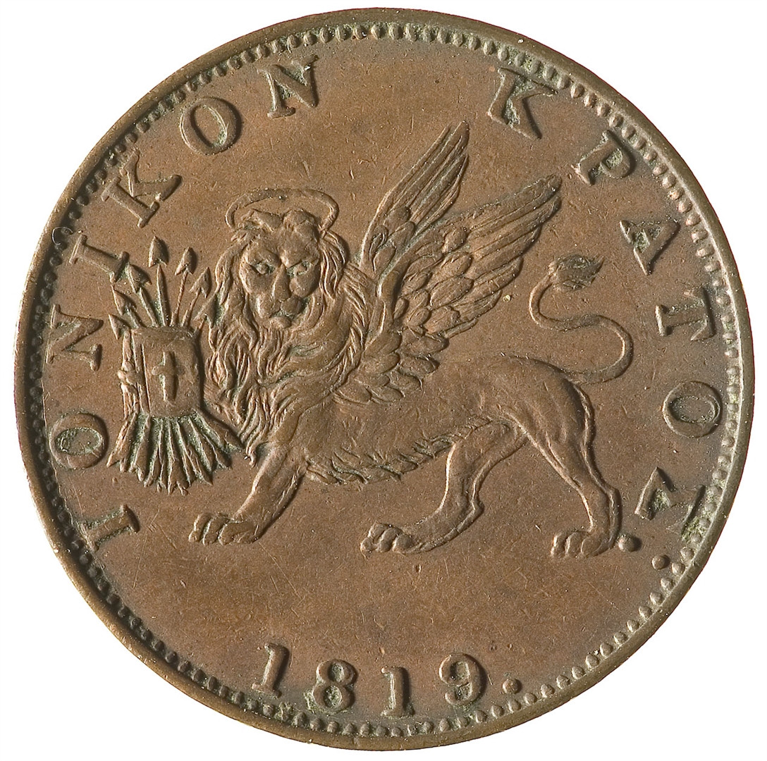 Avers: u sredini je lav sv. Marka okrenut ulijevo, drži Bibliju i sedam strelica, ispod njega je godina 1819; uz rub teče natpis na grčkom jeziku: IONIKON KPATOΣ Revers: personfikacija Britanije u sjedećem položaju, u desnoj ruci drži grančicu, u lijevoj trozubac, a uz nju je štit; uz rub, iznad središnjeg polja teče natpis: BRITANNIA