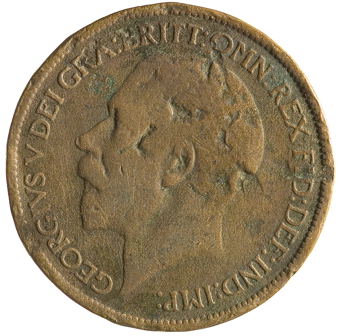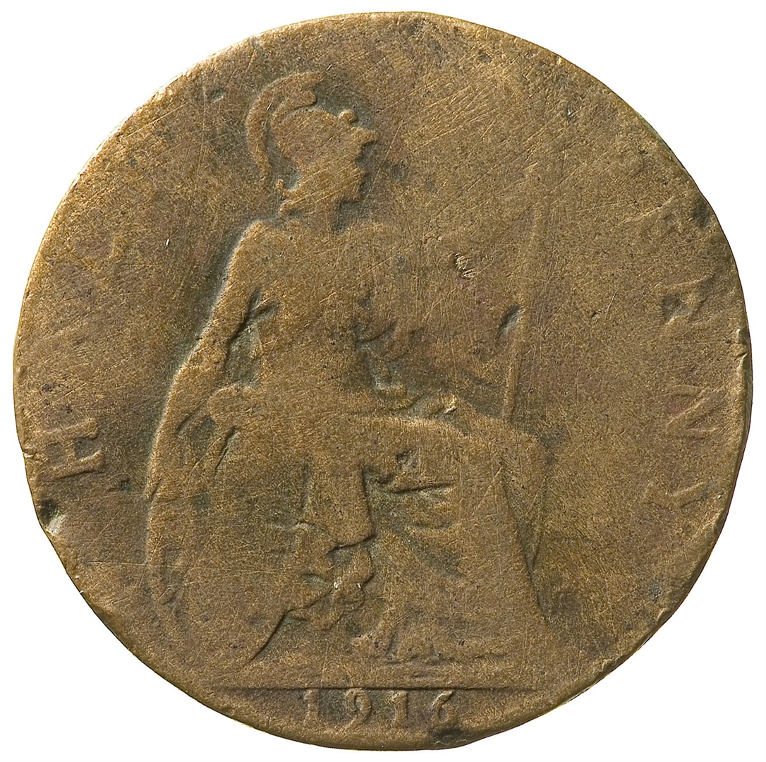 Avers: portret neokrunjenog kralja Georgea V okrenut ulijevo; uz rub teče natpis: GEORGIVS V DEI GRA:BRITT:OMN:REX FID:DEF:IND:IMP Revers: personifikacija Britanije u sjedećem položaju okrenuta udesno, s truzopcem u lijevoj ruci, štitom za zastavom Unije; ispod nje je godina 1916 u egzergu, a uz rub teče natpis: HALF PENNY