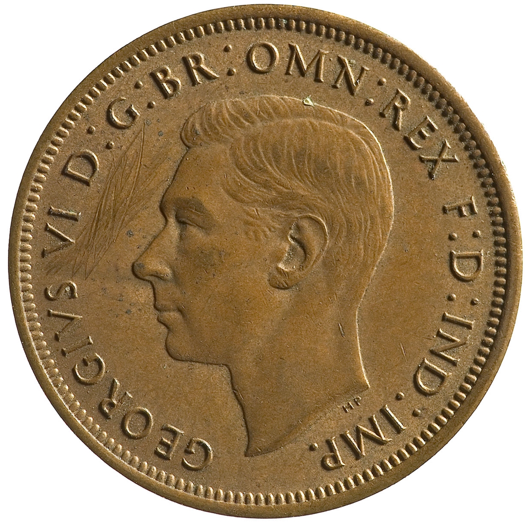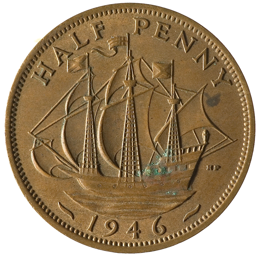 Avers: portret neokrunjenog kralja Georgea VI okrenut ulijevo; ispod je sitno oznaka gravera: HP; uz rub teče natpis: GEORGIVS VI D:G:BR:OMN:REX F:D:IND:IMP: Revers: brod s tri jarbola plovi ulijevo; desno od njega je sitno izvedena oznaka gravera: HP; uz gornji rub teče vrijednost nominale: HALF PENNY, a uz donji rub je godina 1946