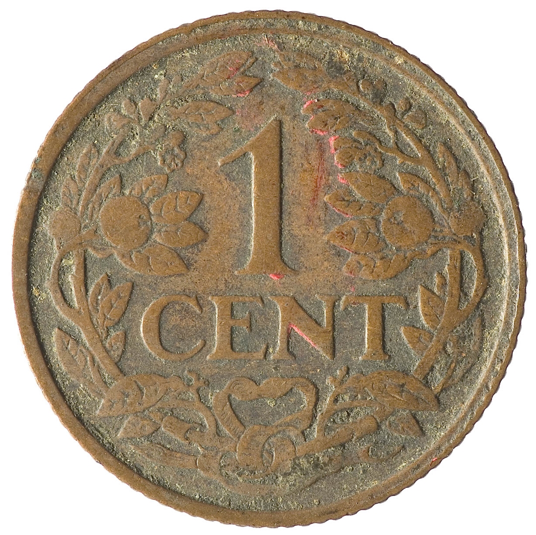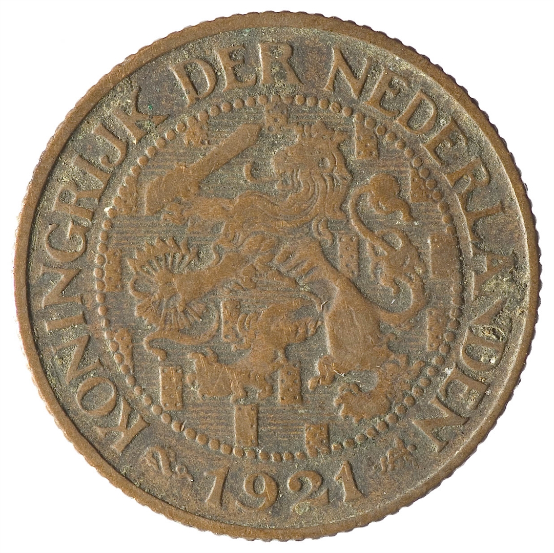 Avers: okrunjen lav unutar središnjeg kružnog polja od petnaest malih štitova obrubljenog perlama, uz rub teče natpis: KONINGRIJK DER NEDERLANDEN i godina 1921 Revers: vrijednost 1 / CENT unutar vijenca