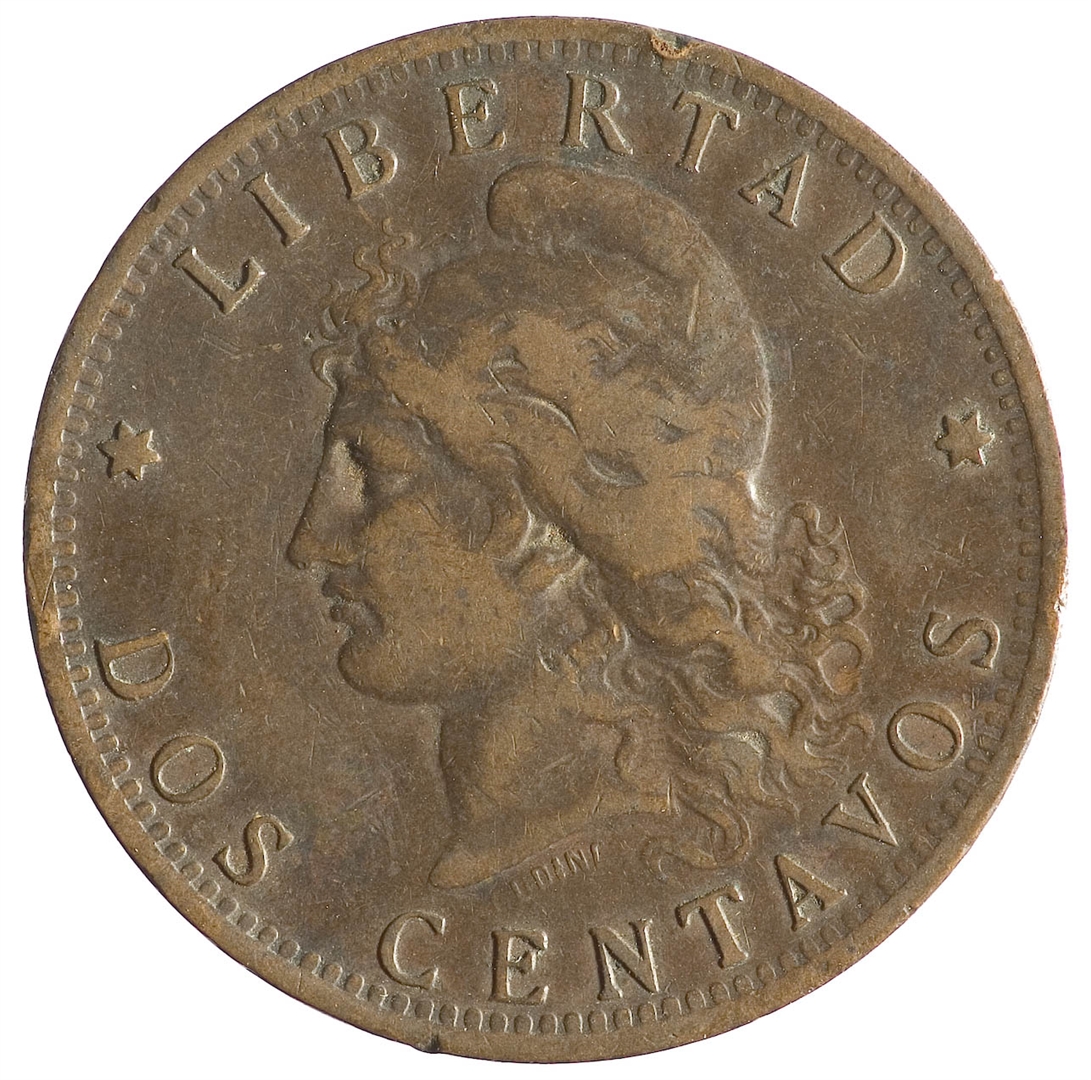 Avers: grb Argentinu unutar kruga oblikovanog od perli; ispod je godina *1884*, a uz rub teče natpis: REPUBLICA ARGENTINA Revers: portret personifikacije Slobode s frigijskom kapom, ispod je prezime OUDINÉ; uz rub teče natpis: LIBERTAD * DOS CENTAVOS *