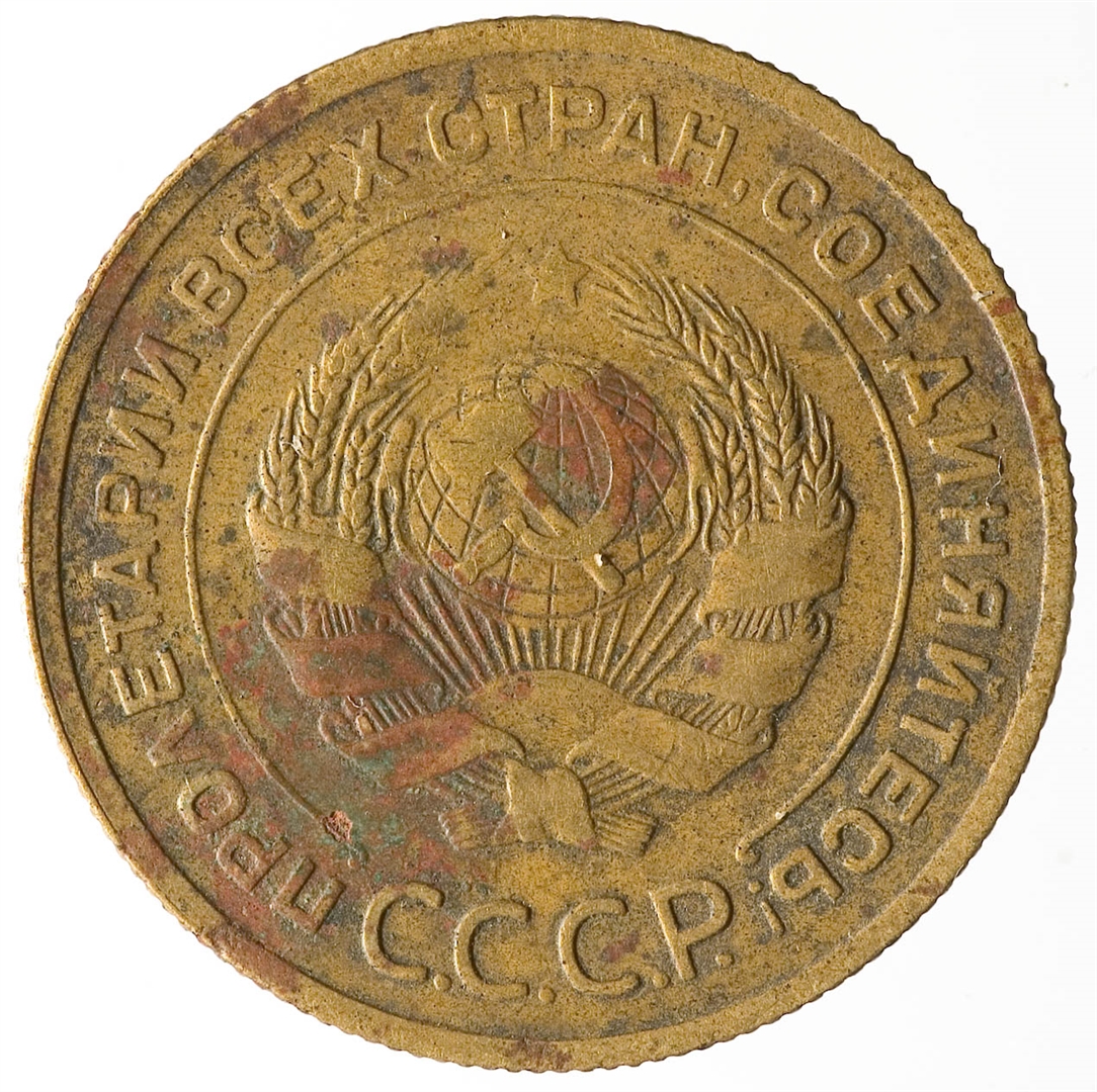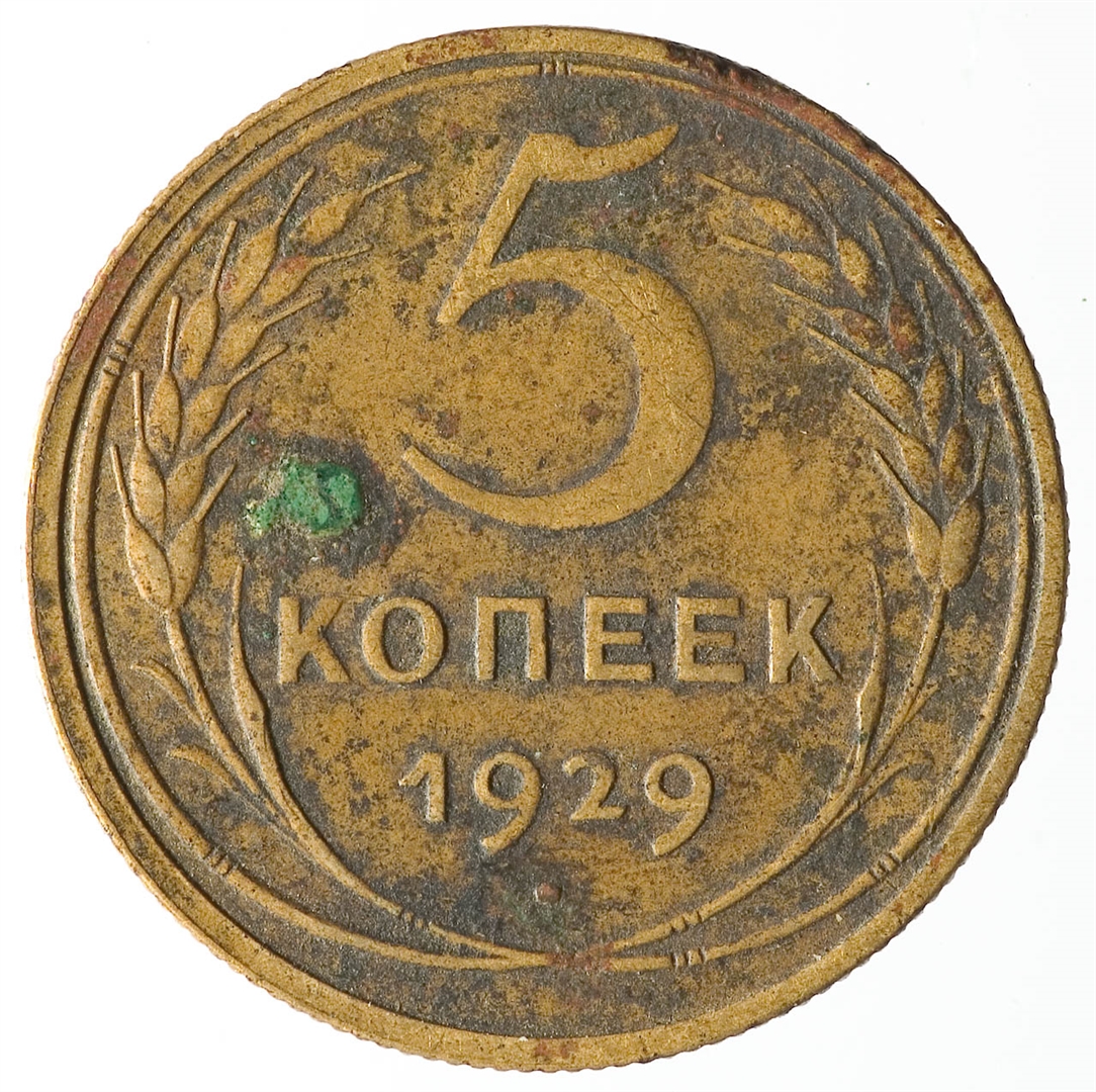 Avers: u središnjem obrubljenom polju je grb Sovjetskog Saveza; uz rub teče natpis: ПРОЛЕТАРИИ ВСЕХ СТРАН,СОЕДИНЯЙТЕСЬ! С.С.С. Revers: godina i vrijednost obrubljene klasjem pšenice: 5 / KOΠEEK / 1929