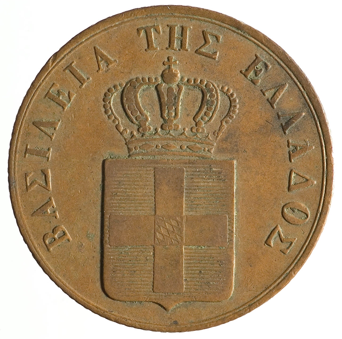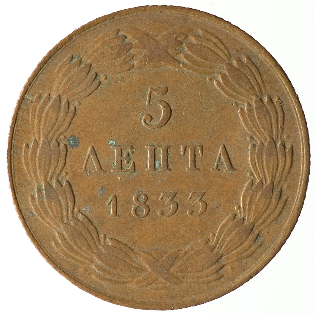 Avers: okrunjen štit sa križem; uz rub teče natpis: ΒΑΣΙΛΕΙΟΝ ΤΗΣ ΕΛΛΑΔΟΣ Revers: vrijednost 5 / ΛEΠTA i godina 1833 unutar vijenca