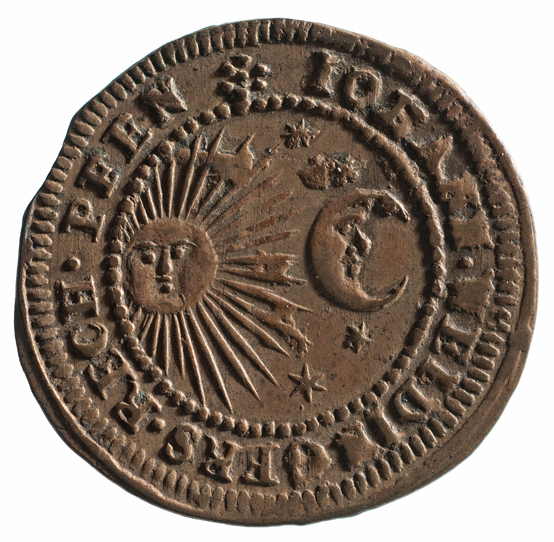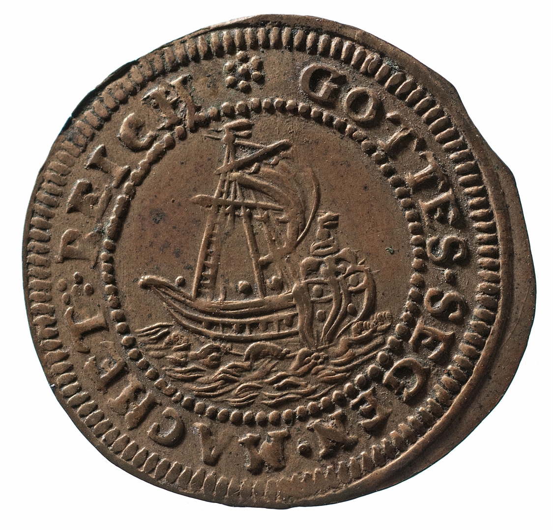 Avers: sunce s lijeve strane, mjesec i zvijezde s desne, unutar kruga oblikovanog od perli; uz rub teče natpis: IOHANN•WELDINGERS•RECH•PFEN Revers: brod (jedrenjak) plovi ulijevo, unutar kruga oblikovanog od perli; uz rub teče natpis: MACHET*REICH*GOTTES•SEGEN•