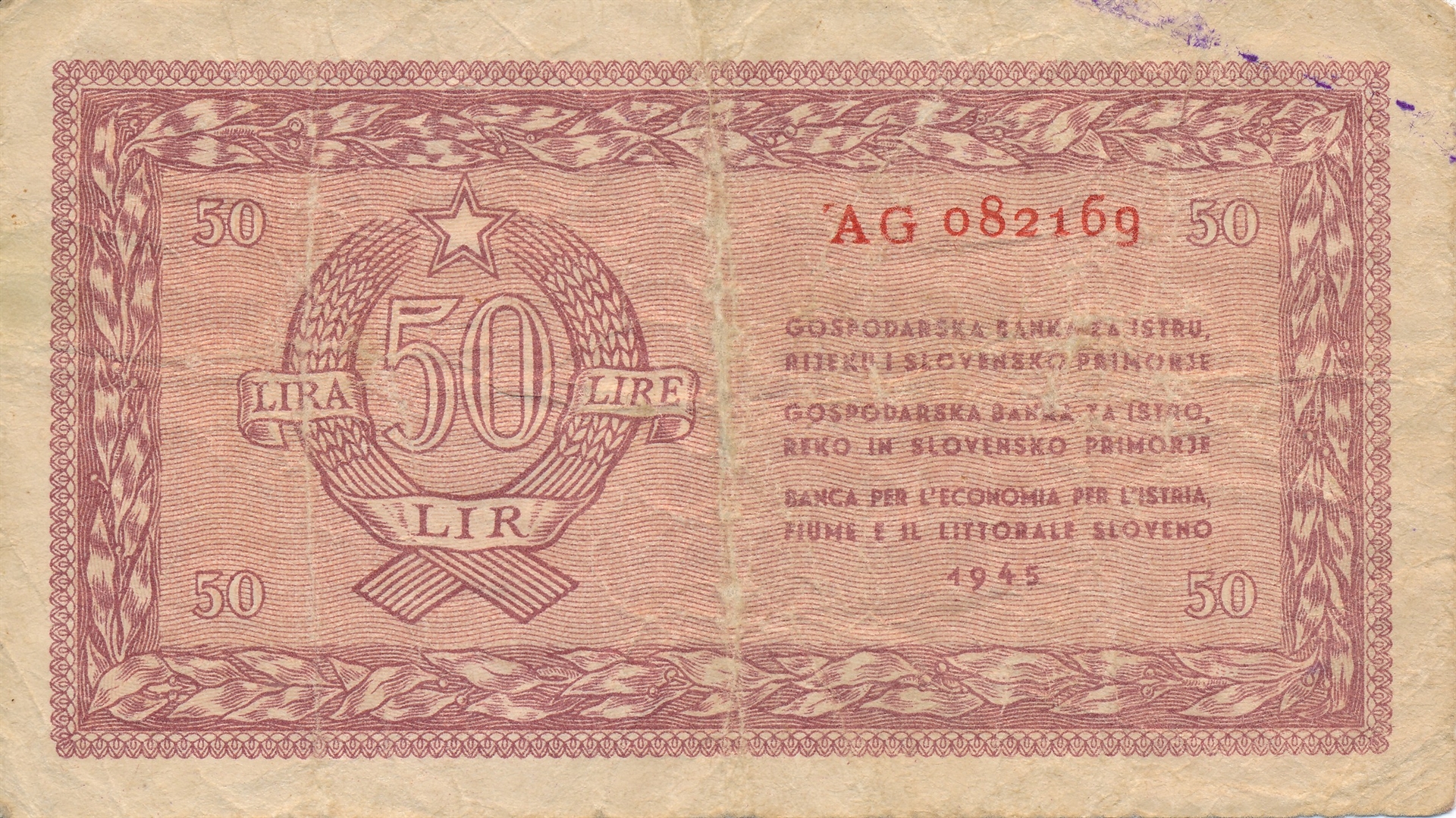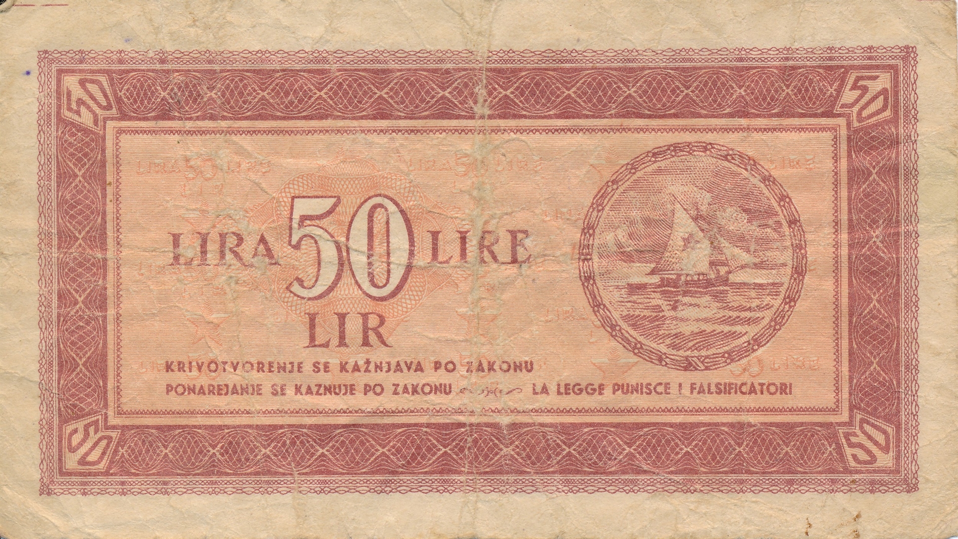 Banca per l''Economica per l''Istria Fiume e il Littorale Sloveno 1945 Revers: s lijeve strane je denominacija 50 (50 LIRA LIRE LIR); ispod je natpis: Krivotvorenje se kažnjava po zakonu Ponarejanje se kaznuje po zakonu La legge punisce i falsificatori; s desne strane je jedrenjak na moru i dvije ptice u kružnom okviru, partizanska komunistička crvena zvijezda petokraka na jedru