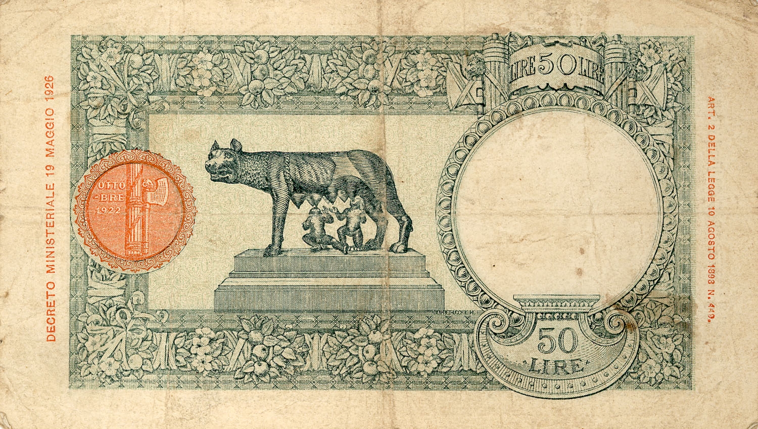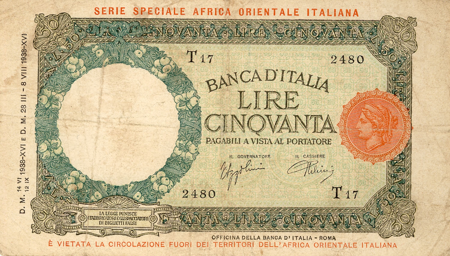 Avers: pečat - profil personifikacij Italije desno; natpis: SERIE SPECIALE AFRICA ORIENTALE ITALIANA CINQVANTA LIRE CINQVANTA BANCA D''ITALIA LIRE CINQVANTA PAGABILI A VISTA AL PORTATORE IL GOVERNATORE IL CASSIERE LA LEGGE PUNISCE I FABBRICATORI E GLI SPACCIATORI DI BIGLIETTI FALSI CINQVANTA LIRE CINQVANTA OFFICINA DELLA BANCA D''ITALIA - ROMA E'' VIETATA LA CIRCOLAZIONE FUORI DEI TERRITORI DELL''AFRICA ORIENTALE ITALIANA Revers: u središtu je kip vučice s Romulom i Remom; natpis: DECRETO MINISTERIALE 19 MAGGIO 1926 LIRE 50 LIRE ART. 2 DELLA LEGGE 10 AGOSTO 1893 N. 449. 50 LIRE