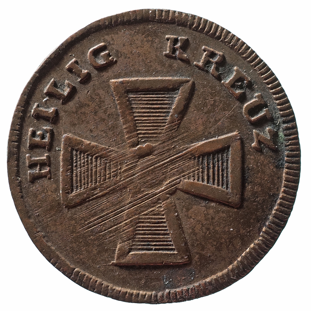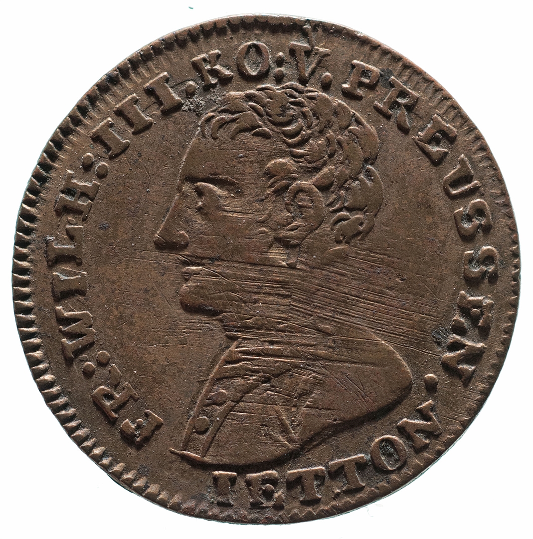 Avers: poprsje kralja F. Wilhelma III u uniformi, okrenuto ulijevo; ispod natpis: IETTON; uz rub teče natpis: FR:WILH:III.KO:V. PREUSSEN. Revers: u središnjem polju je malteški križ; uz rub gornje polovice žetona teče natpis: HEILIG KREUZ