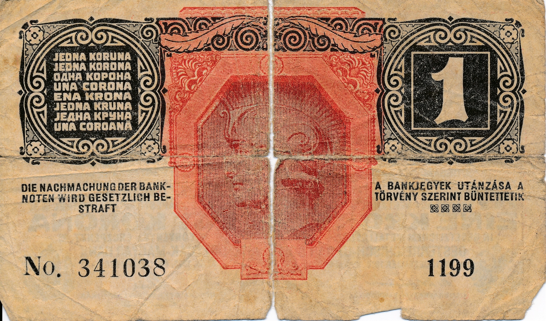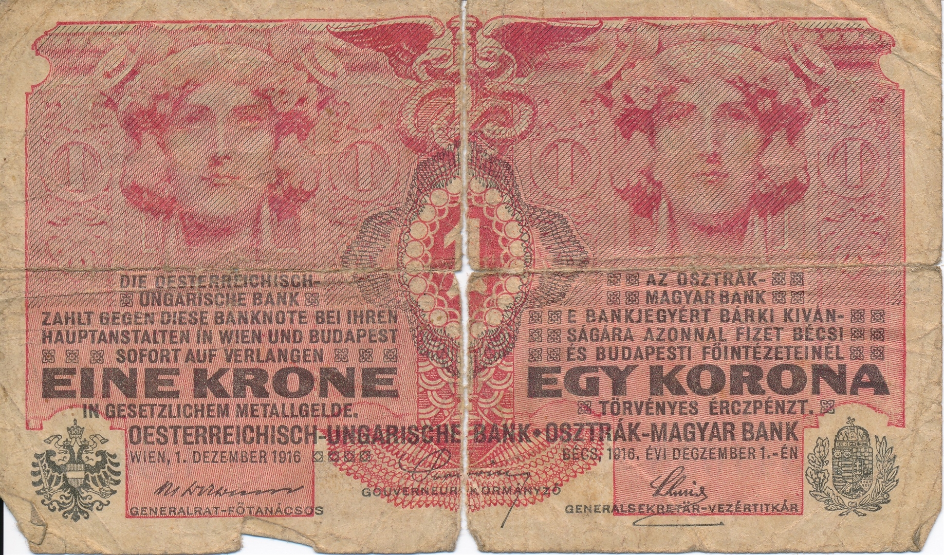 Avers: gore lijevo i desno ženska glava , između njih kaducej kao simbol trgovine i nominala unutar ukrasnog okvira, dolje lijevo grb Austrije, dolje desno grb Mađarske, ispod tekst na njemačkom i mađarskom jeziku: DIE OESTERREICHISCH- UNGARISCHE BANK EINE KRONE WIEN, 1. DEZEMBER 1916, potpis Revers: u sredini portret osobe sa šljemom, okrenut ulijevo; lijevo unutar ukrasnog kvadratnog okvira oznaka vrijednosti na osam drugih jezika monarhje, desno unutar istovjetnog okvira nominala; lijevo i desno natpisi: 1 JEDNA KORUNA JEDNA KORONA ОДНА КОРОНА UNA CORONA ENA KRONA JEDNA KRUNA JЕДНА КРУНА UNA COROANĂ DIE NACHMACHUNG DER BANK- NOTEN WIRD GESETZLICH BE- STRAFT ispod je serijski broj