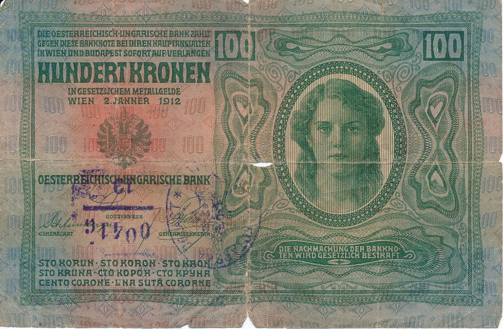 Avers: lijevo mali grb Austro-Ugarske monarhije i tekst na njemačkom jeziku: DIE OESTERREICHISCH:UNGARISCHE BANK ZAHLT GEGEN DIESE BANKNOTE BEI IHREN HRUPTANSTALTEN IN WIEN UND BUDAPEST SOFORT AUF VERLANGEN HUNDERT KRONEN IN GESETZLICHEM METALLGELDE WIEN 2 JANNER 1912 OESTERREICHISCH-UNGARISCHE BANK GENERALRAT GOUVERNEUR GENERALSEKRETAR