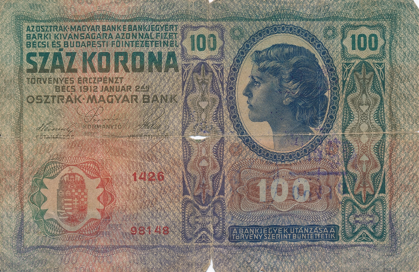 STO KORUN STO KORON STO KRUNA CTO КОРОН CENTO CORONE UNA SUTA COROANE, preko dijela teksta udaren je pečat; desno portret žene u kružnom okviiru, ispod je natpis: DER MACHMACHUNG DER BANKNOTEN WIRD GESETZUCH BESTRAFT Revers: lijevo gore je natpis na mađarskom jeziku: AZ OSZTRAK MAGYAR BANK E BANKJEGYERT BARKI KIVANSAGARA AZONNAL FIZET BECSI BUDAPESTI FOINTEZETEINEL SZAZ KORONA TORVENYES ERCZPENZT BECS 1912 JANUAR 2AN OSZTRAK MAGYAR BANK FOTANACSOS KORMANYZO VEZERTITKAR ispod je grb Mađarske uz koji je serijski broj; desno je portret žene okrenute ulijevo unutar kružnog polja, ispod i gore bočno je nominala 100, a ispod tekst: A BANKJEGYEK UTANZASA A TORVENY SZERINT BUNTETTIK