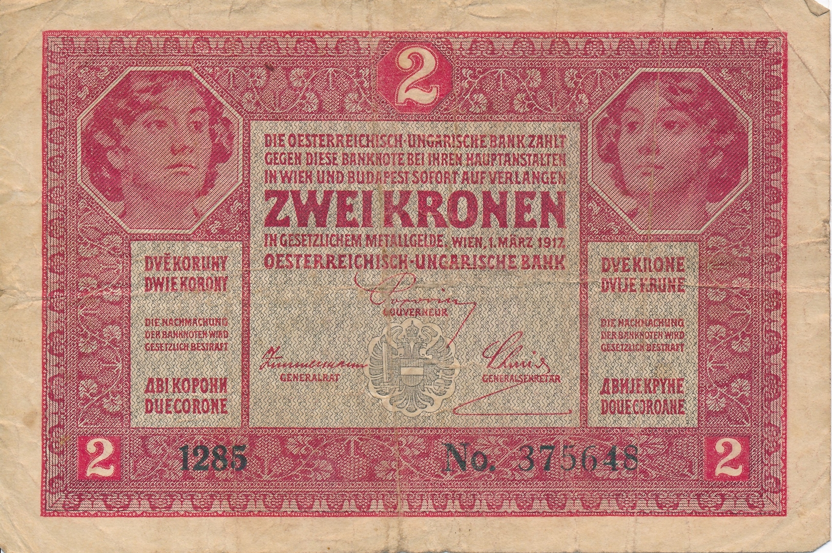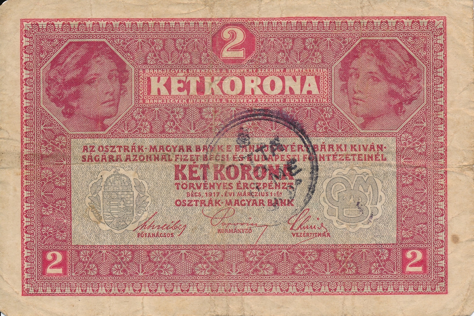 Avers: gore u sredini vrijednost 2, ispod natpis: DIE OESTERREICHISCH:UNGARISCHE BANK ZAHLT GEGEN DIESE BANKNOTE BEI IHREN HRUPTANSTALTEN IN WIEN UND BUDAPEST SOFORT AUF VERLANGEN ZWEI KRONEN IN GESETZLICHEM METALLGELDE WIEN, 1. MÄRZ 1917 OESTERREICHISCH-UNGARISCHE BANK GENERALRAT GOUVERNEUR GENERALSEKRETAR, između je grb Austro-Ugarske monarhije, lijevo i desno portret žene, ispod natpisi: DVEKORUNY DWIE KORONY DIE MACHMACHUNG DER BANKNOTEN WIRD GESETZUCH BESTRAFT ДBI KOPOНИ DUECORONE DVEKRONE DVIJE KRUNE DIE MACHMACHUNG DER BANKNOTEN WIRD GESETZUCH (pisano ćiriličnim pismom), ispod je serijski broj i nominala u oba ugla Revers: gore u sredini vrijednost 2 KET KORONA, lijevo i desno portret žene; ispod natpis na mađarskom jeziku: AZ OSZTRAK MAGYAR BANK E BANKJEGYERT BARKI KIVANSAGARA AZONNAL FIZET BECSI BUDAPESTI FOINTEZETEINEL KET KORONA TORVENYES ERCZPENZT BECS 1917, ÉVI MARCZIUS 1AN OSZTRAK MAGYAR BANK FOTANACSOS KORMANYZO VEZERTITKAR, lijevo i desn od natpisa su grbovi Mađarske