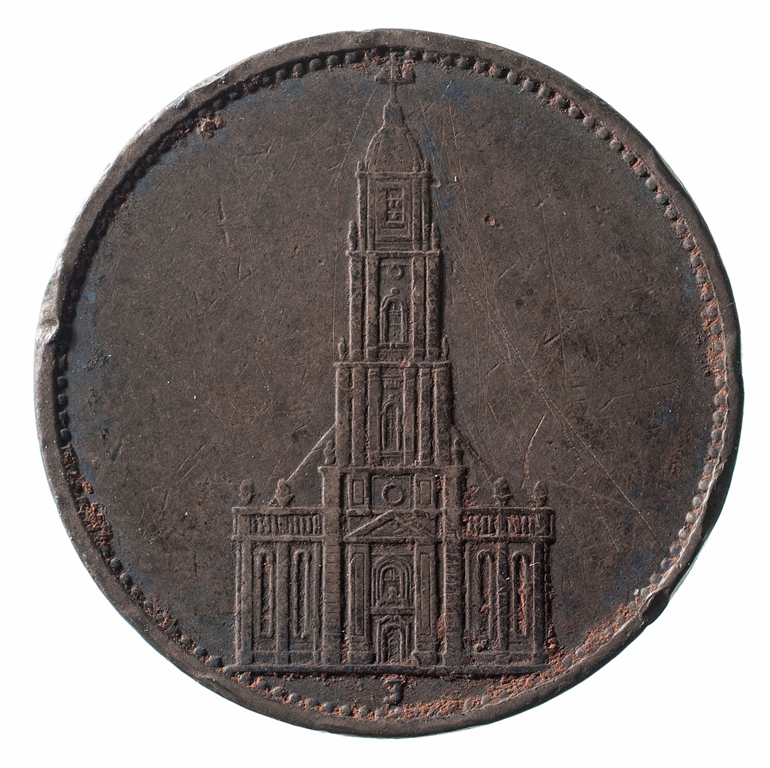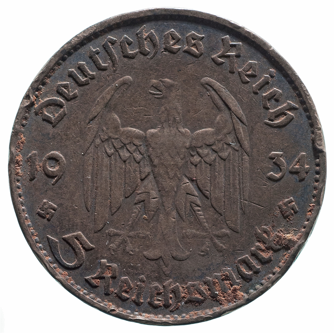Avers: njemački orao dijeli godinu 1934, iznad je natpis: Deutsches Reich, a ispod oznaka vrijednosti: 5 Reichsmark Revers: Potsdamska garnizonska crkva i oznaka kovnice ispod: B ili J (?)