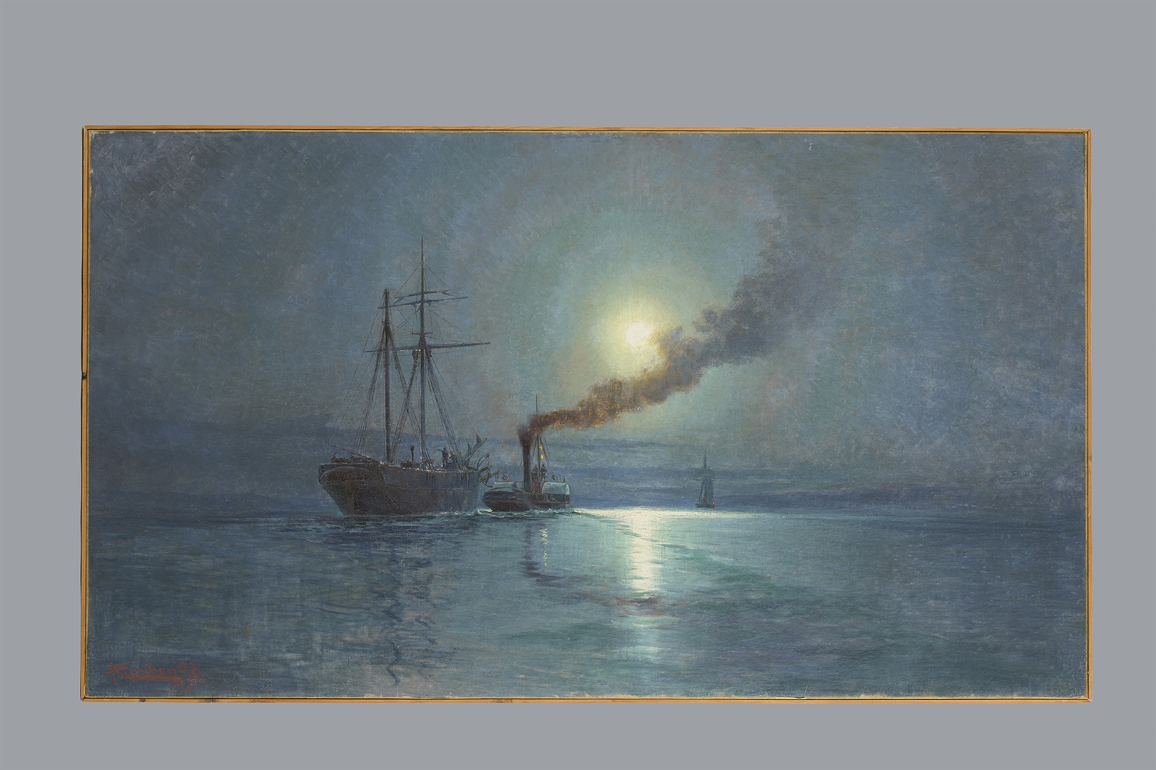 Ulje na platno. Brodovi u mjesečini. U prvom planu parni brod do njega levo jedrenjak sa spuštenim jedrima. U pozadini desno jedrenjak u pokretu sa crvenim svijetlom na desnom boku. U sredini gore mjesec. (Inventarna knjiga II.)