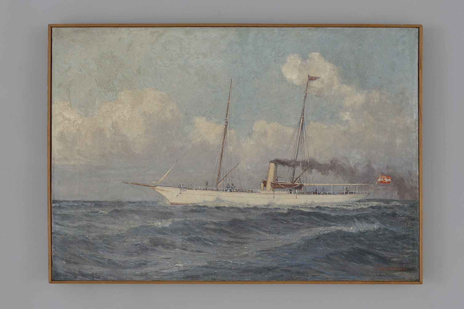 Ulje na platno. Jahta u pokretu sa razvijenom crveno bijelom zastavom. (Inventarna knjiga II.)