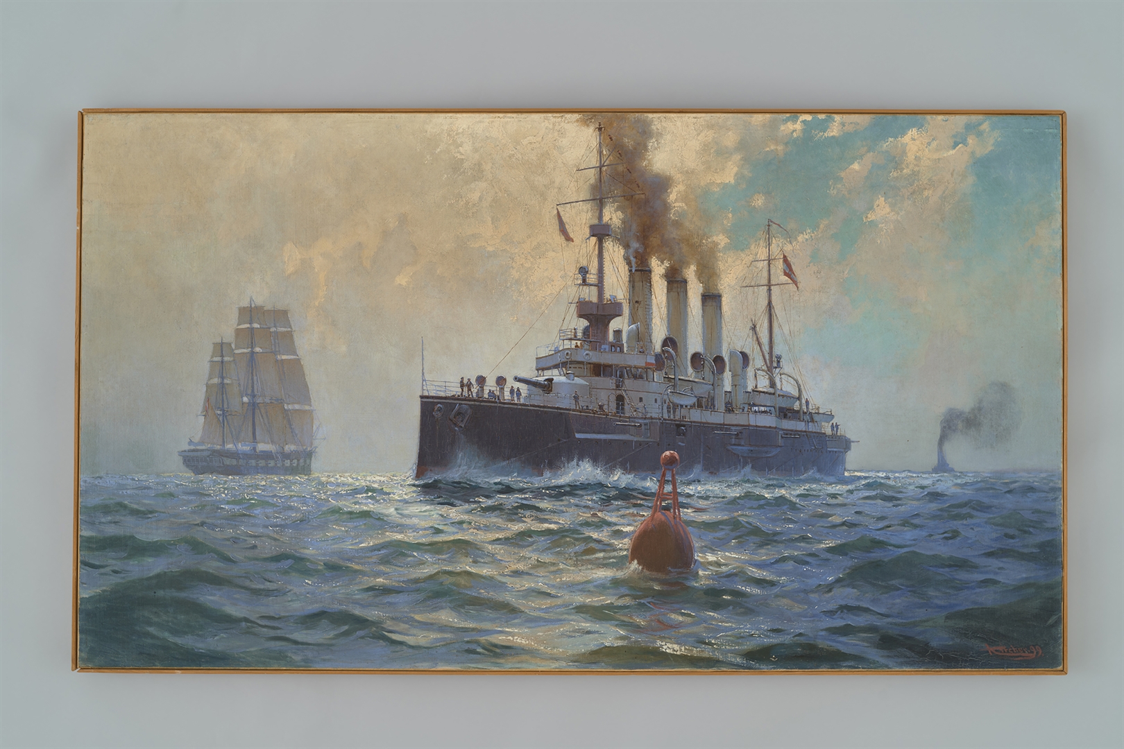 Ulje na platno. Autor: A. Kircher 1899. Ratni brod sa tri dimnjaka. Crvena boa ispred ratni brod jedrenjak u levom uglu a u desnom parni brod. Platno oštećeno kod bove i u desnom uglu gore. (Inventarna knjiga II.)
