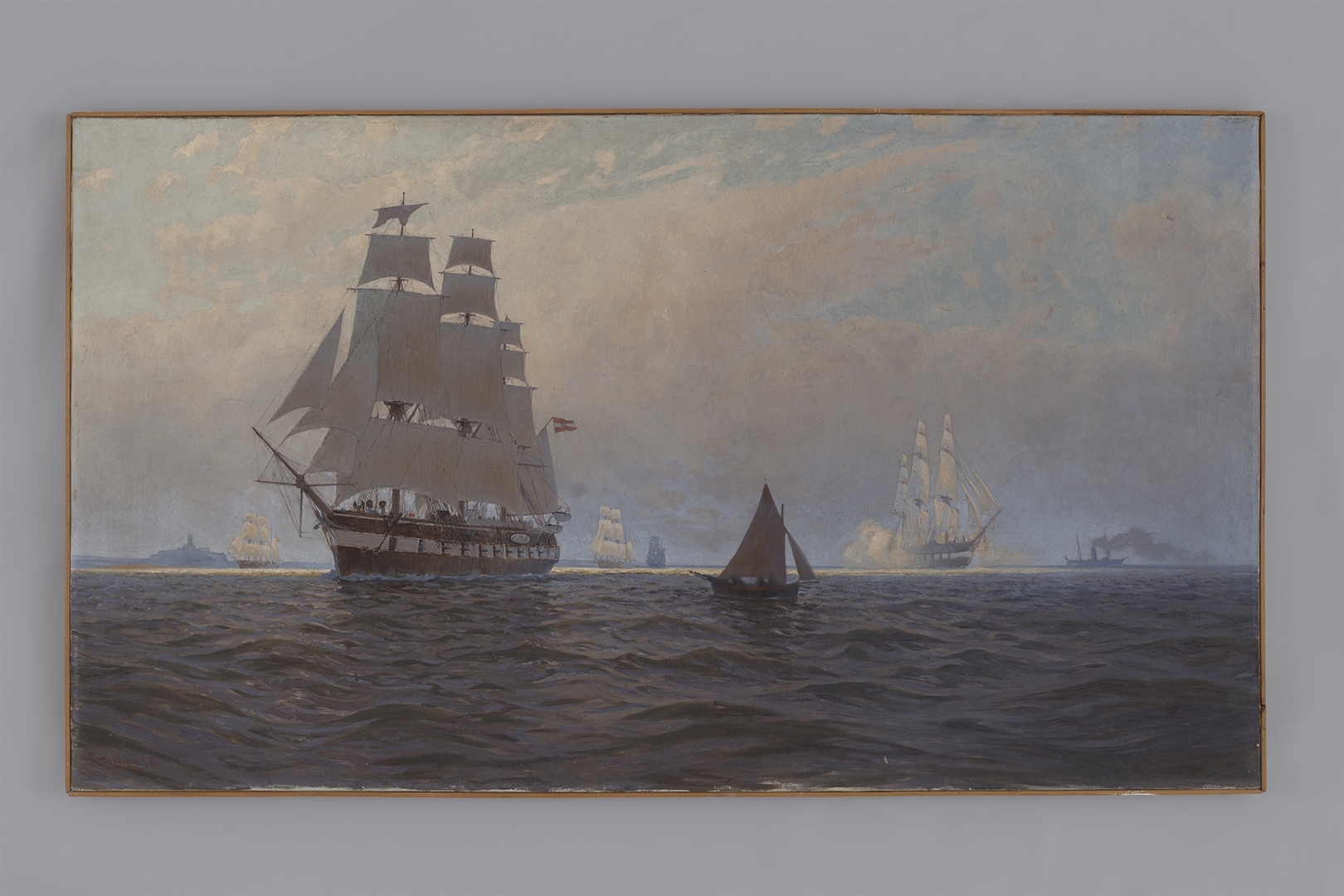 Ulje na platno. U prvom planu ratni brod jedrenjak. Ispred njega mali čamac na jedra. U pozadini lijevo svjetionik i u punoj svjetlosti tri jedrenjaka. Desno parabrod. Van svijetla u sredini drugi brod. More olovno plavo. Nebo svijetlo plavo sa ružičastim oblacima. Alex Kircker 1898. (Inventarna knjiga II.)