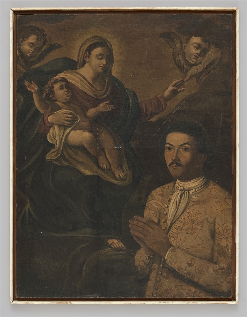 Ex voto. Meksikanska škola U prvom planu s desne strane, čovjek koji moli. Ima crnu kosu i brkove, žuto usko odjelo od damaska s redom sitnih dugmadi i bijelu košulju. Ruke spojene u molitvu. Iza njega, u drugom planu gore, Madona sa dijetetom obučena u haljinu višnjeve boje i plavi plašt. Na glavi i oko ramena bijeli veo. Dijeti sjedi njoj u krilu sa raširenim rukama i povijeno bijelom maramom. Iza Madone, dva kerubina, jedan u desnom a drugi u lijevom. Pozadina smeđa. (Inventarna knjiga 1-3, 1. tom)